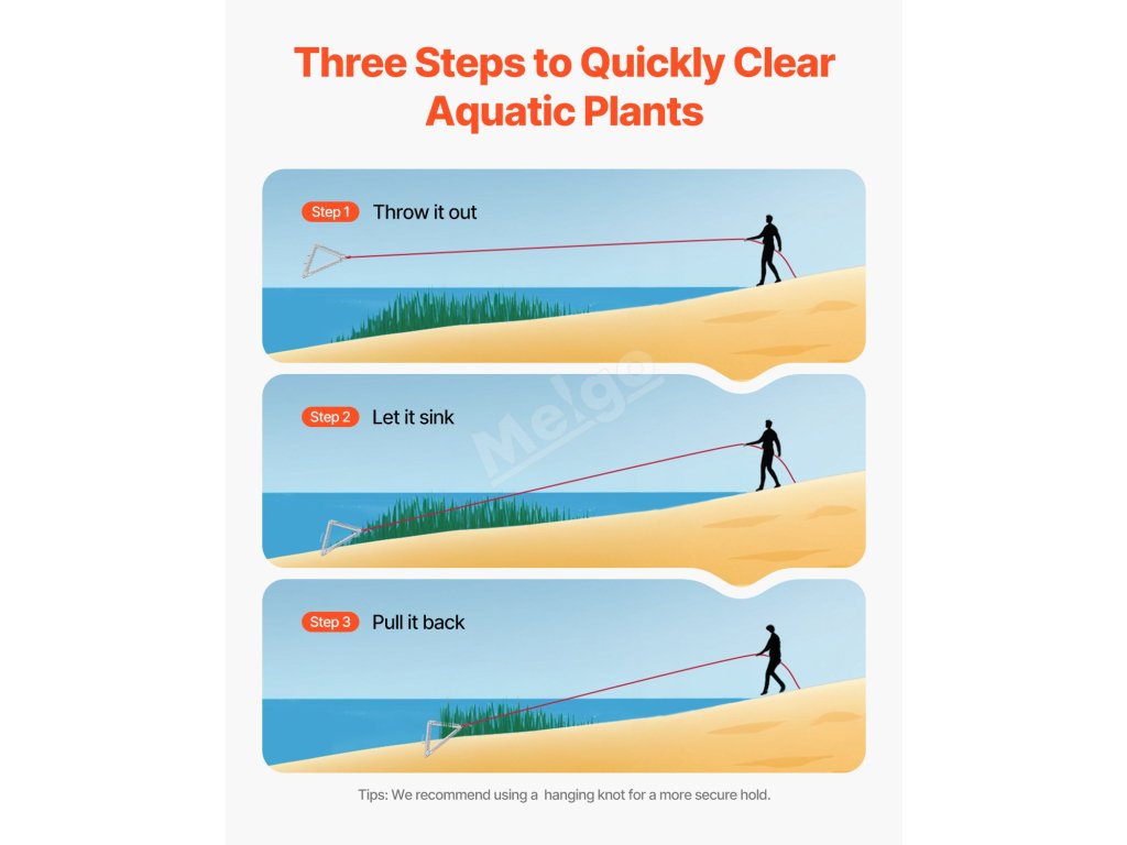 Spusťte hrábě do vody, nechte je klesnout ke dnu a pak opatrně uchopte plevel. Jednoduchým zatažením za lano odstraňte plevel z hladiny. Bezpečná rukojeť zajišťuje stabilní a bezpečné házení. Pro důkladnější úklid použijte nejprve hrábě s násadou a poté tyto hrábě s lanem.