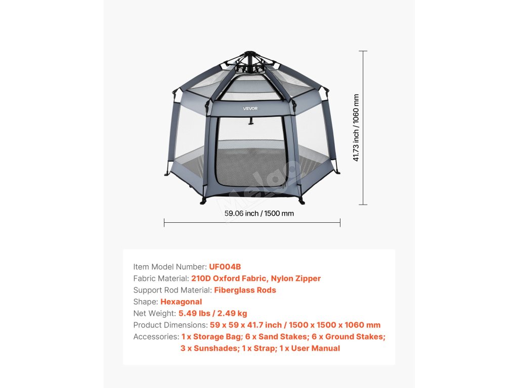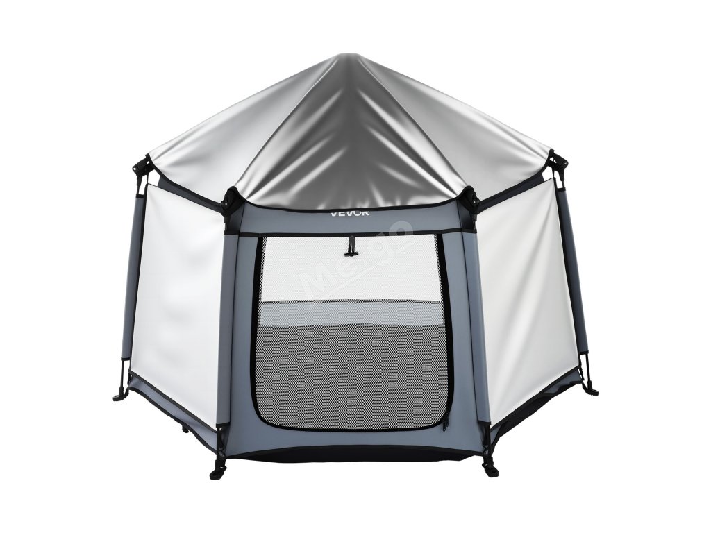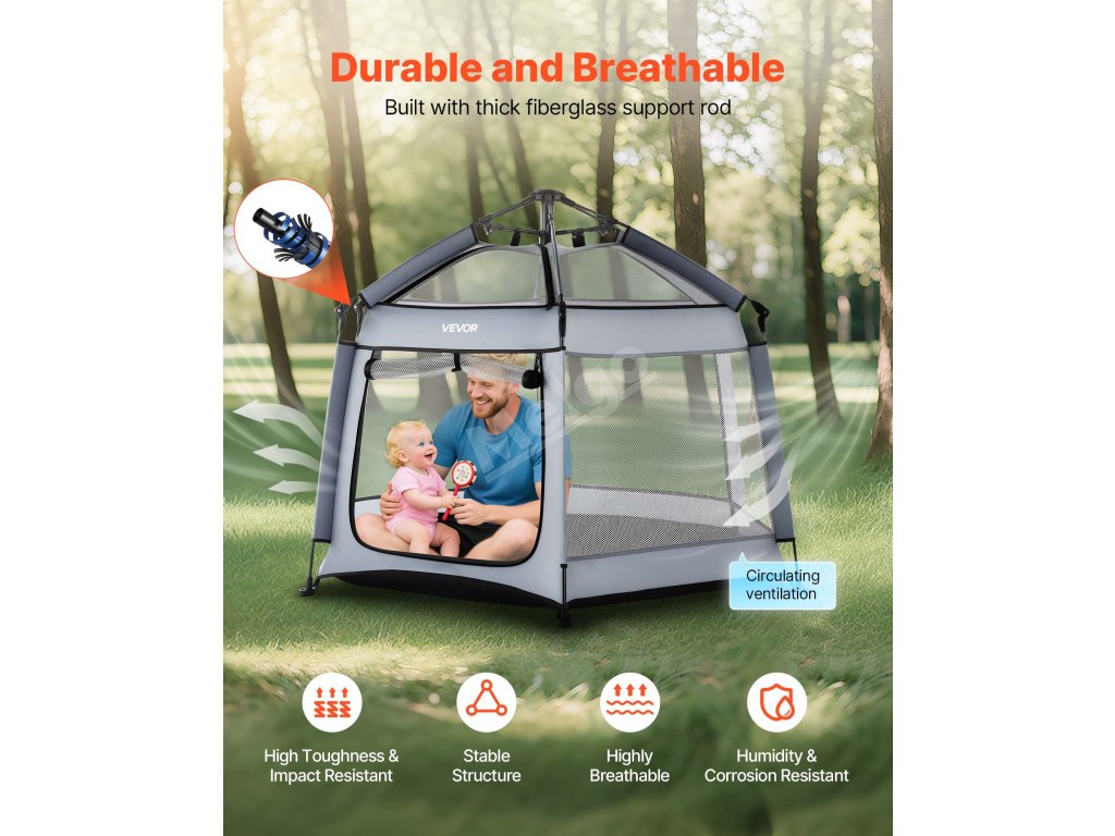 Poskytněte svému děťátku bezpečný prostor pro hraní a objevování s prostornou ohrádkou VEVOR 59 x 59 palců (1500 x 1500 mm), která má vysouvací konstrukci, stříšku se stříškou po celé délce, prodyšnou síťovinu, 3 sluneční clony UPF 50+ a tkaninu 210D Oxford bez BPA. Skládací a přenosná pro cestování, venkovní dobrodružství.