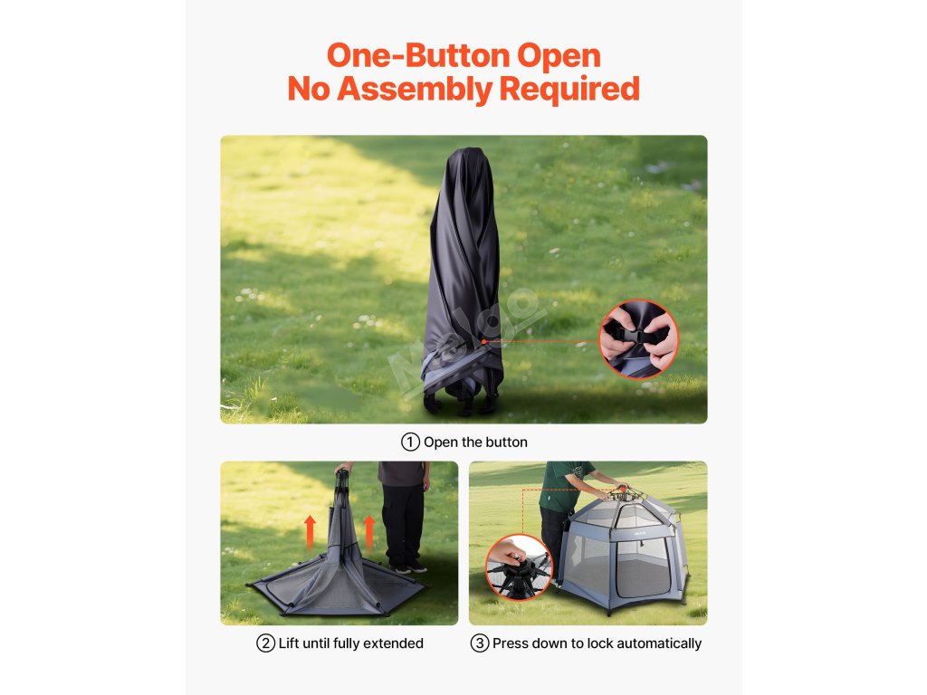 Nechte své dítě hrát si bezpečně a vy si užívejte klid. Tato ohrádka je vybavena celoplošnou konstrukcí, která zabraňuje vylézání dítěte ven, konstrukcí bez mezer, která zabraňuje odírání prstů, a prodyšnou průhlednou síťovinou, která zajišťuje proudění vzduchu a zároveň vám umožňuje mít dítě na očích. Upozornění: Hrací podložka není součástí balení, připravte si ji prosím samostatně.