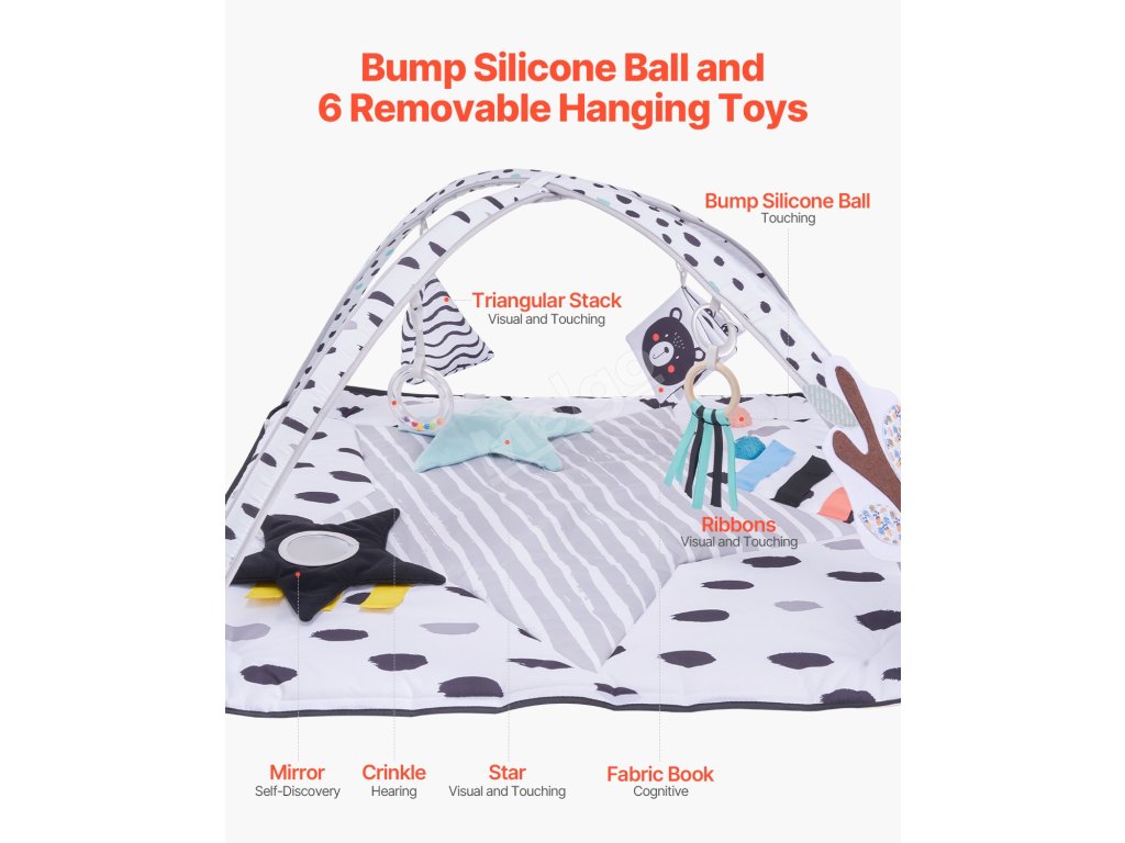 Naše hrací podložka je nezbytná pro rozvoj smyslových a motorických dovedností dítěte. 34.velká hrací podložka o rozměrech 4" x 34,4" se 6 smyslovými hračkami je ideální pro děti v kognitivní fázi, pomáhá jim vnímat, objevovat a zkoumat svět, podporuje kognitivní růst a zdravý vývoj.
