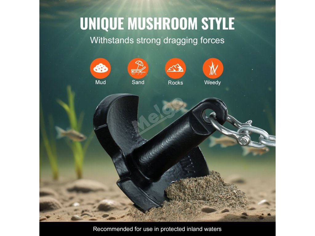 Naše říční kotva se svou třídílnou hřibovitou konstrukcí bez námahy proniká bahnem, pískem a štěrkem a poskytuje výjimečnou stabilitu při použití na moři, v řekách i na moři.