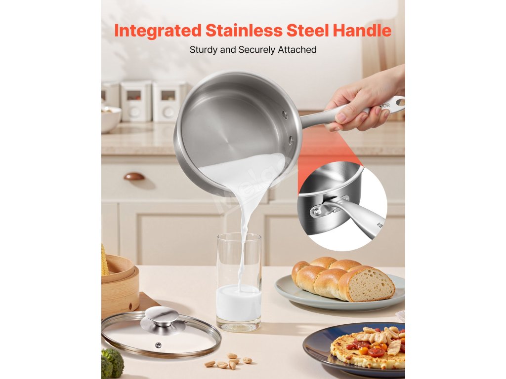 Naše pánev na omáčku z nerezové oceli je dodávána s poklicí ze zesíleného čirého skla, která umožňuje sledovat průběh vaření. Rozšířený okraj umožňuje nalévat polévku a mléko bez odkapávání. Nýtovaná jednodílná kovová rukojeť zajišťuje odolnost a zabraňuje uvolnění nebo zlomení během používání.