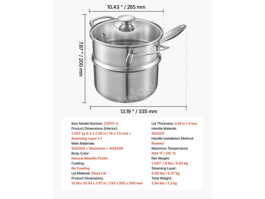| Rozměry výrobku (vnitřní) | 1.5QT (φ 6,3 x 2,95 palce / 16 x 7,5 cm) + napařovací vrstva x 1 |