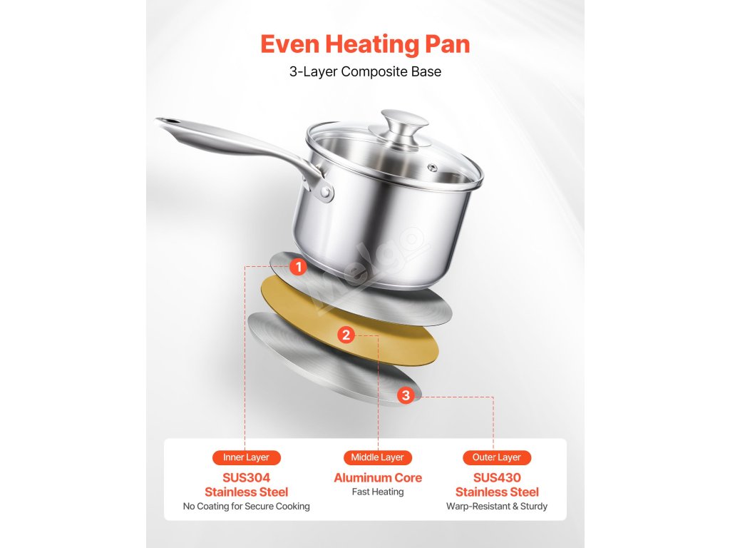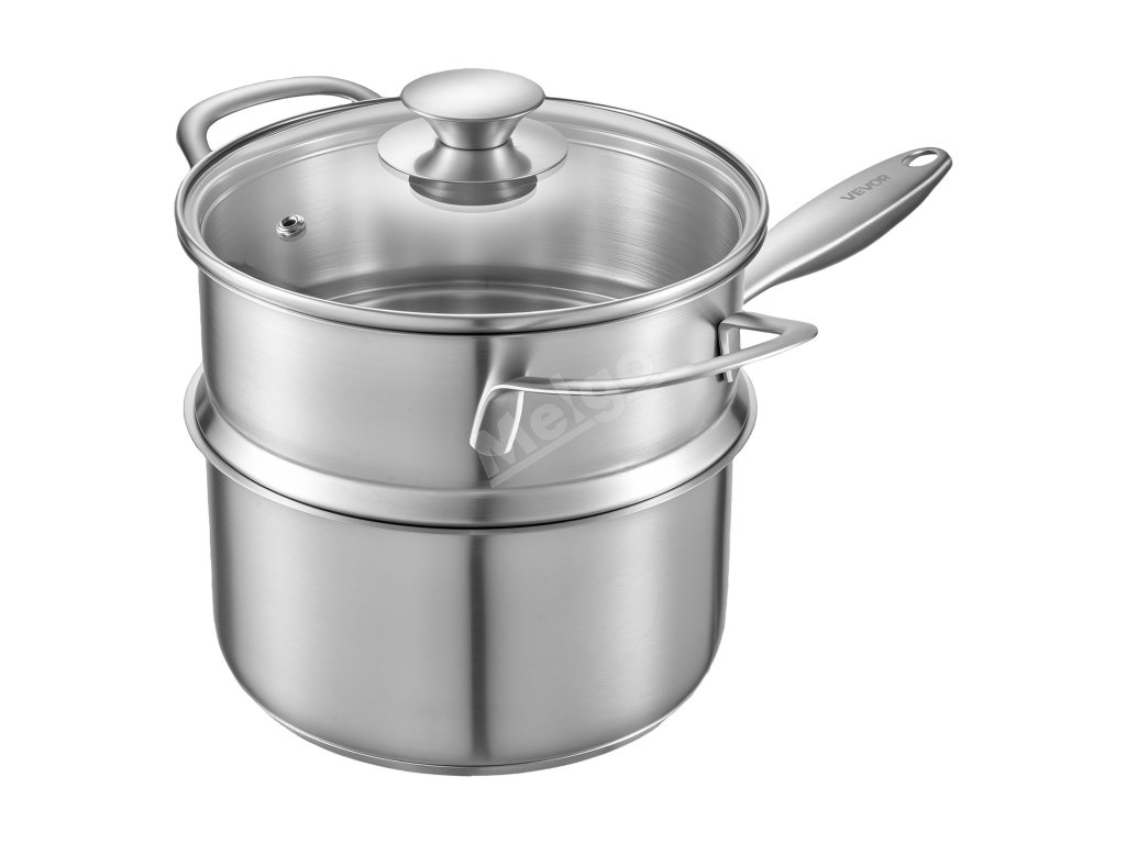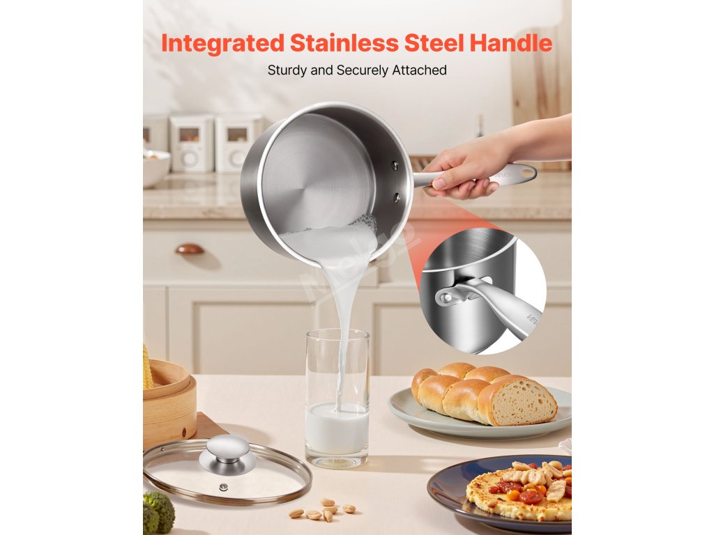 Naše pánev na omáčku z nerezové oceli je dodávána s poklicí ze zesíleného čirého skla, která umožňuje sledovat průběh vaření. Rozšířený okraj umožňuje nalévat polévku a mléko bez odkapávání. Nýtovaná jednodílná kovová rukojeť zajišťuje odolnost a zabraňuje uvolnění nebo zlomení během používání.
