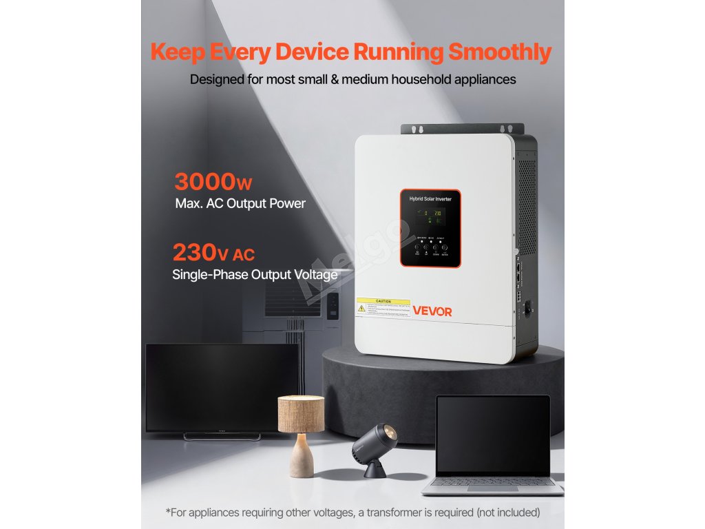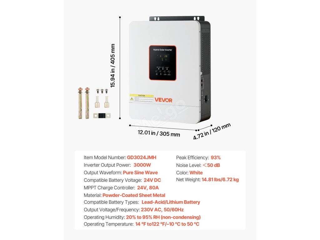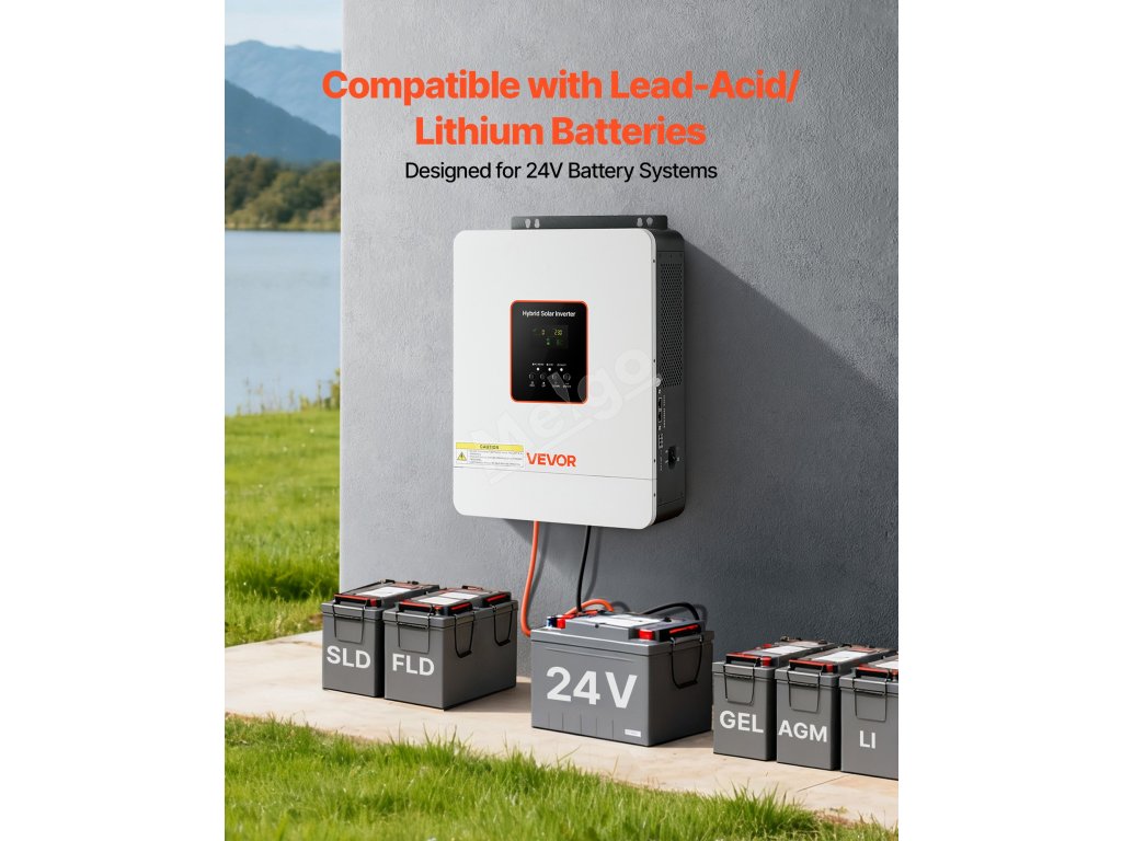 Kombinuje měnič a regulátor v jednom zařízení. Poskytuje výkon 3000 W čistého sinusového výstupu a zajišťuje stabilní napájení vašich spotřebičů. Díky pokročilé nabíjecí technologii MPPT dosahuje až 99% účinnosti přeměny. Kompatibilní s lithiovými, olověnými a LiFePO4 akumulátory.
