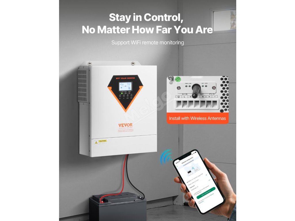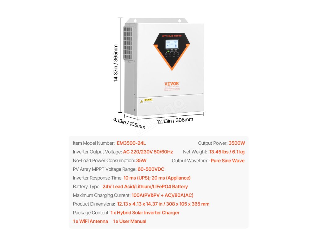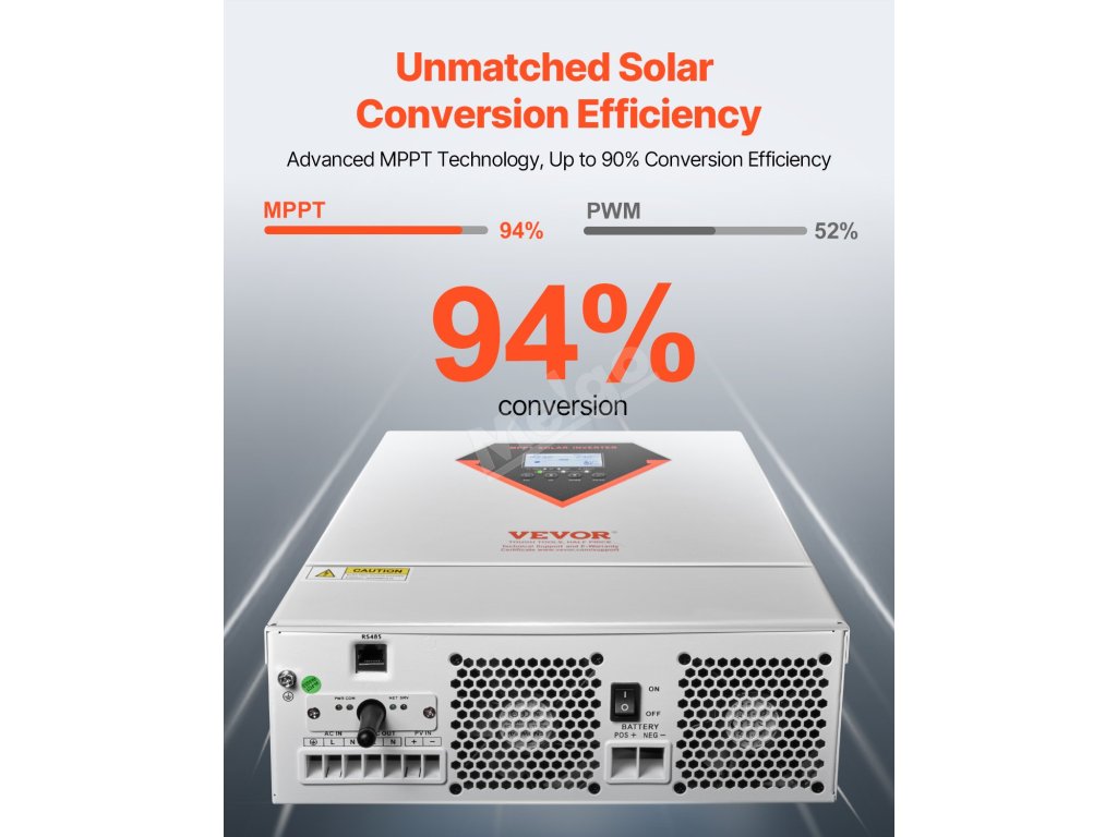 Náš hybridní regulátor solárního střídače 2 v 1 poskytuje 3500 W čistého sinusového výkonu a může se pochlubit působivým špičkovým výkonem 7000 VA. Pokročilá technologie MPPT dosahuje až 94% účinnosti konverze. Je kompatibilní s lithiovými, olověnými a LiFePO4 bateriemi a má funkci aktivace lithiových baterií.