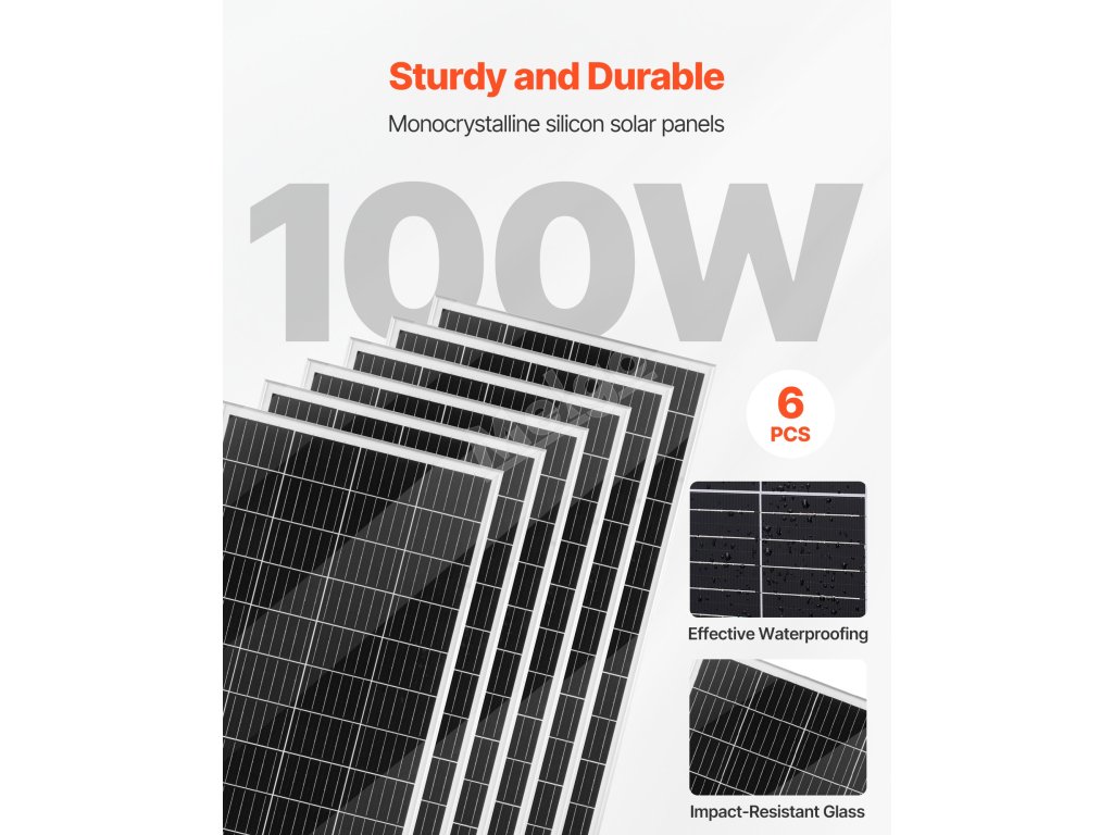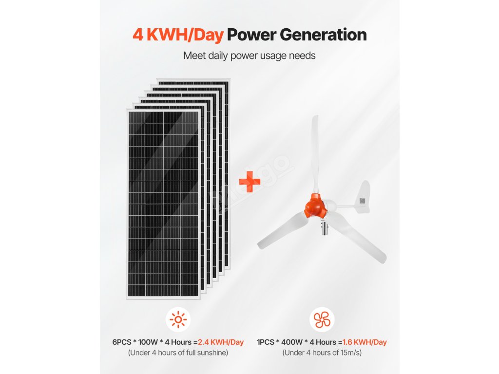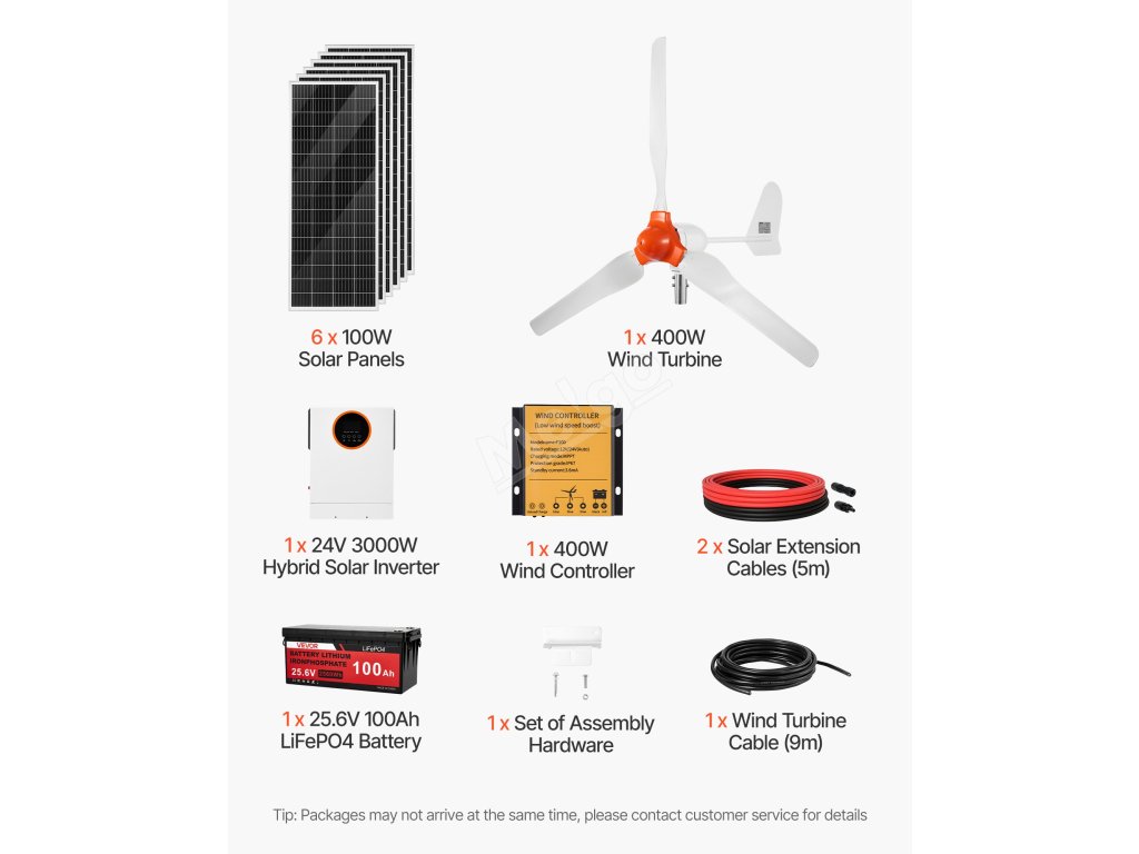 Snadná instalace. Obsahuje 6 x 100W solární panely, 1 x 400W větrnou turbínu, 1 x MPPT regulátor větru, 1 x 24V 3000W hybridní solární střídač, 1 x 25,6V 100Ah LiFePO4 baterii, 2 x solární prodlužovací kabely (5 m), 1 x kabel větrné turbíny (9 m) a sadu montážního příslušenství.