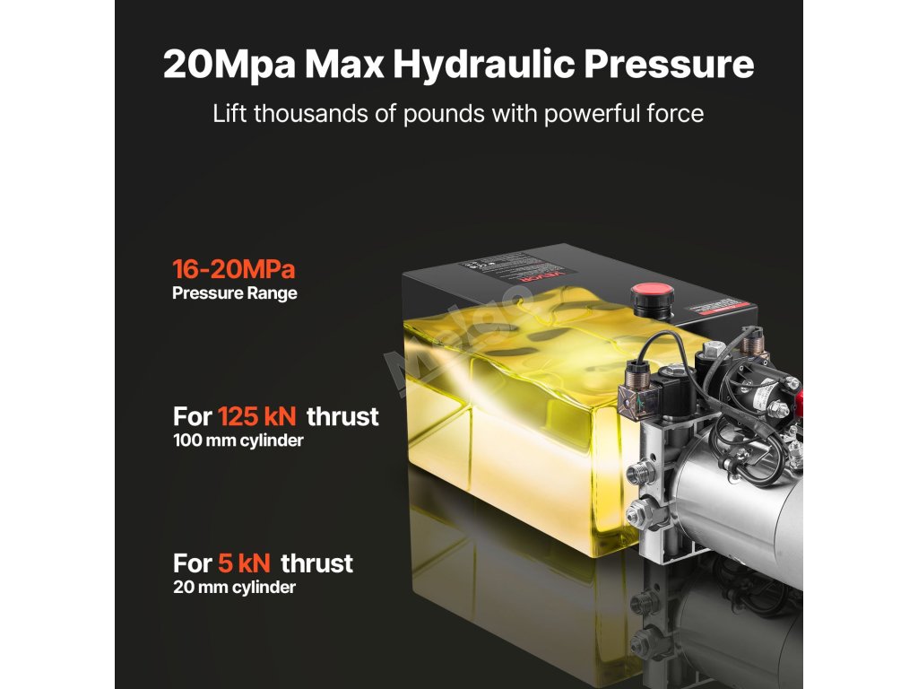 Tato hydraulická pohonná jednotka využívá motor o výkonu 1,6 kW při 2 600 otáčkách za minutu, který dosahuje pracovních tlaků 16-20 MPa a až 22 MPa (3 200 psi). Válce poháníte s jistotou, vysokou zdvihací silou a stabilním výkonem při náročných pracích.