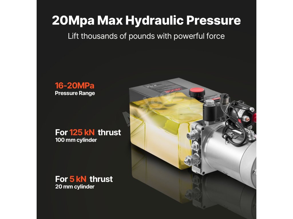 Tato hydraulická jednotka využívá motor o výkonu 1,6 kW při 2 600 otáčkách za minutu, který poskytuje pracovní tlak 16-20 MPa a až 22 MPa (3 200 psi). Válce poháníte s jistotou, vysokou kapacitou zdvihu a stabilním výkonem pro náročné práce.