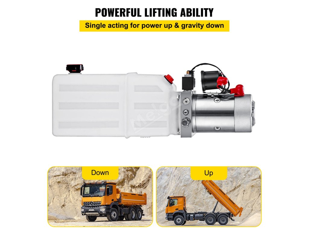 Díky výkonnému stejnosměrnému elektromotoru 12 V se naše hydraulické čerpadlo pro sklápěcí přívěsy rychle spouští a zajišťuje rychlý výstup oleje. Kromě toho může poskytovat silný výkon, který zvedá těžké předměty v krátkém čase.