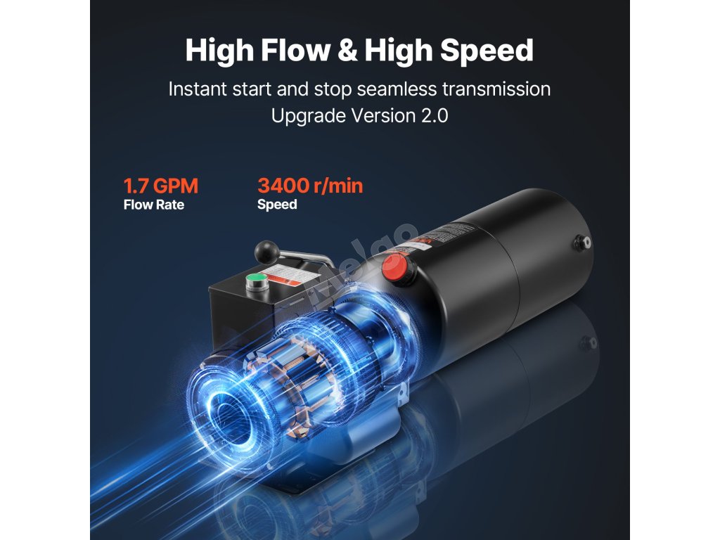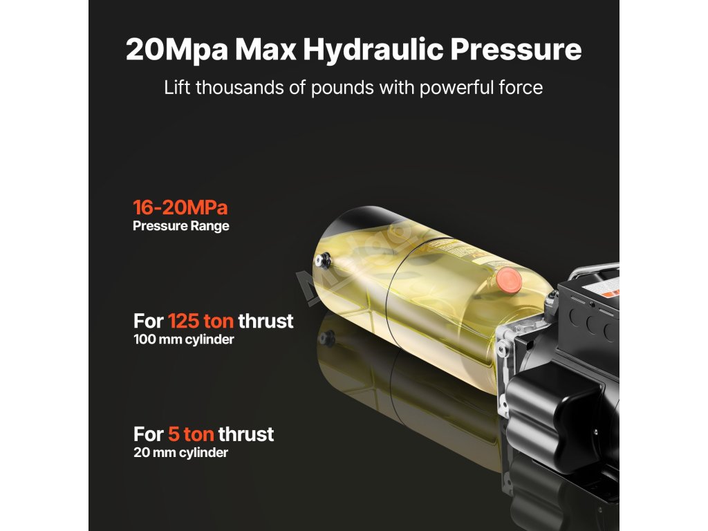 Díky integrovanému bezpečnostnímu ventilu zajišťuje toto hydraulické čerpadlo pro sklápěcí přívěsy bezpečný a efektivní provoz. Jeho odolná nádrž je odolná proti poškození a úniku oleje a nabízí dlouhodobou spolehlivost.