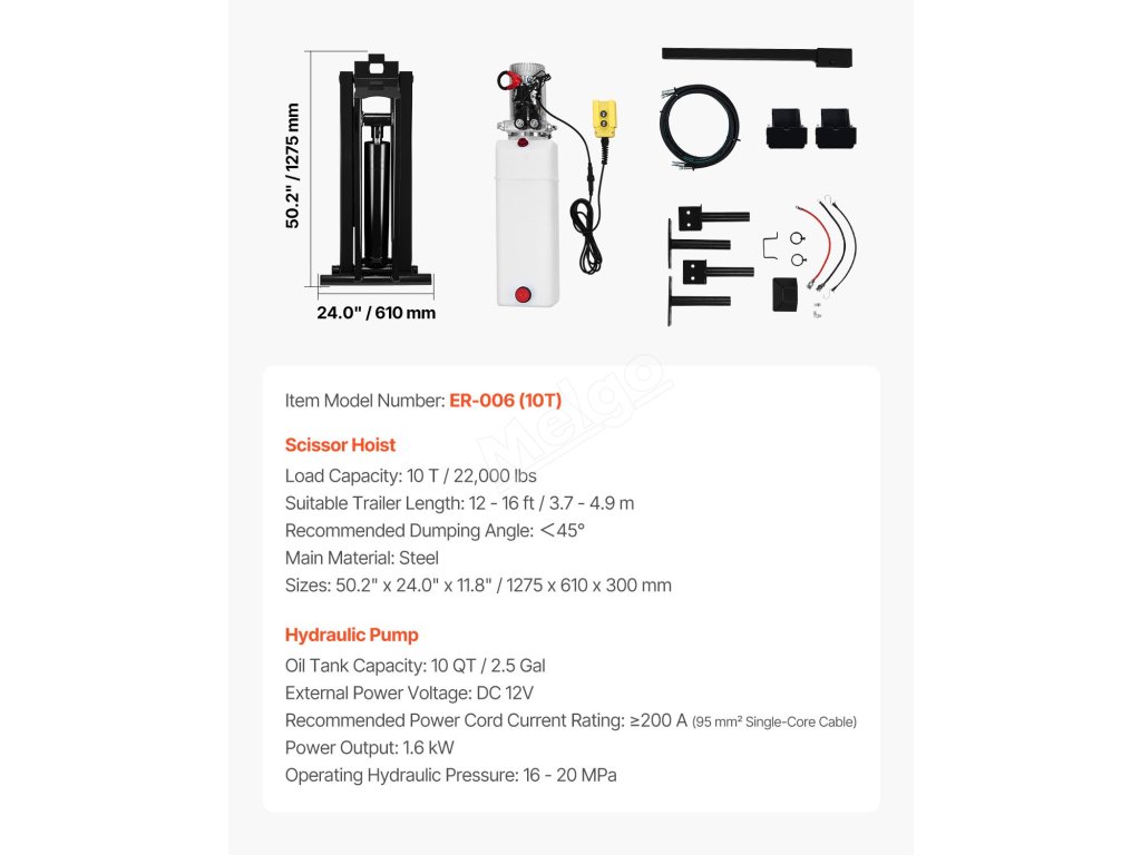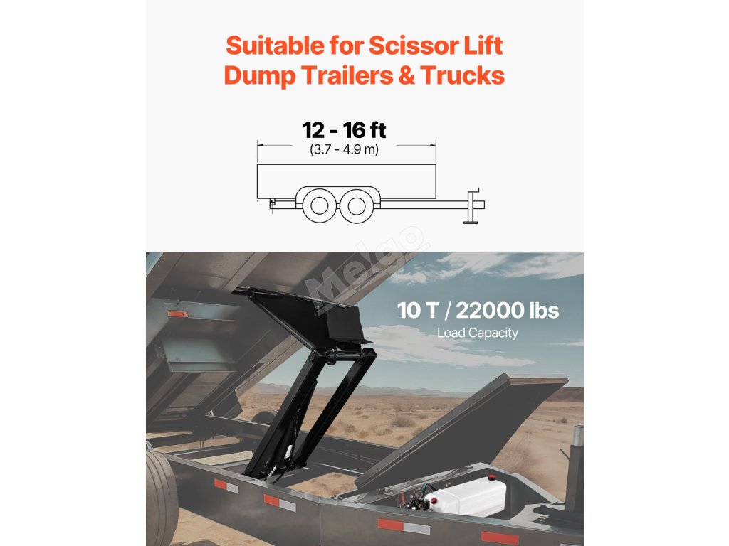 Naše sada hydraulického zvedáku je určena pro 12-16 stop dlouhé sklápěcí vozy a přívěsy, ideální pro výměnu hydraulického zvedáku u velkých nůžkových sklápěcích přívěsů. Udrží až 10 t/22 000 lbs včetně nákladu a lože a nabízí cenově výhodný způsob modernizace a prodloužení životnosti starých přívěsů.