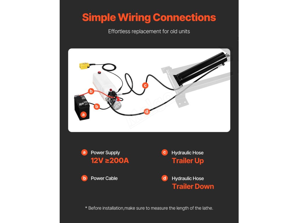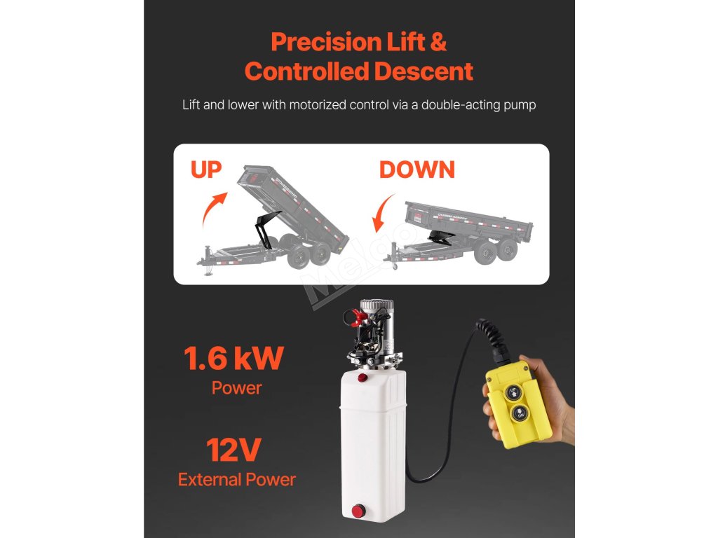 Tato sada hydraulického sklápěcího lůžka je vybavena dvojčinným hydraulickým čerpadlem, které umožňuje motorické ovládání zvedání i spouštění. Je poháněno výkonným 12V stejnosměrným motorem, nabízí rychlý start a rychlý výstup oleje a umožňuje flexibilní ovládání výšky.
