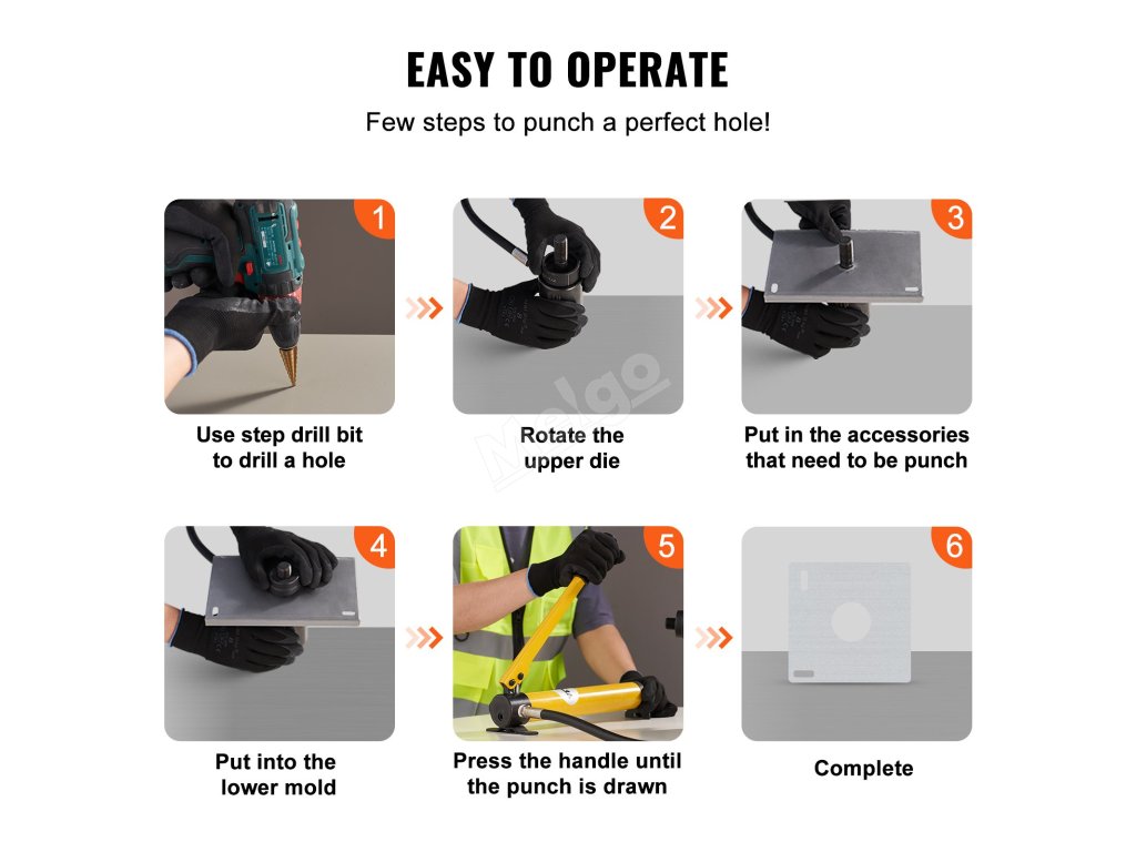 Jeho inovatívny dizajn rozdeľovania výstrižkov uľahčuje a spríjemňuje proces dierovania. Nástroj je navrhnutý na ručné použitie s račňou, kľúčom alebo elektrickým skrutkovačom. Táto flexibilita ho robí vhodným pre rôzne scenáre. Ľahké použitie: Jednoduché použitie zaručuje, že aj začiatočníci môžu dosiahnuť profesionálne výsledky. Používateľsky prívetivý dizajn zahŕňa aj funkcie pre jednoduché odstraňovanie odrezkov. Proces čistenia je tak rýchly a efektívny. Pohodlie a jednoduchosť použitia sú kľúčové vlastnosti, vďaka ktorým je tento nástroj obľúbený u mnohých ľudí.