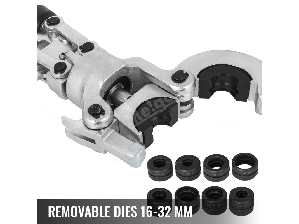 Kleště na krimpování trubek jsou vybaveny osmi vyměnitelnými čelistmi různých velikostí (16 mm, 20 mm, 25 mm, 32 mm), které jsou vhodné pro většinu prací při krimpování trubek. Hlava se snadno otevírá, výměna čelistí je jednoduchá.