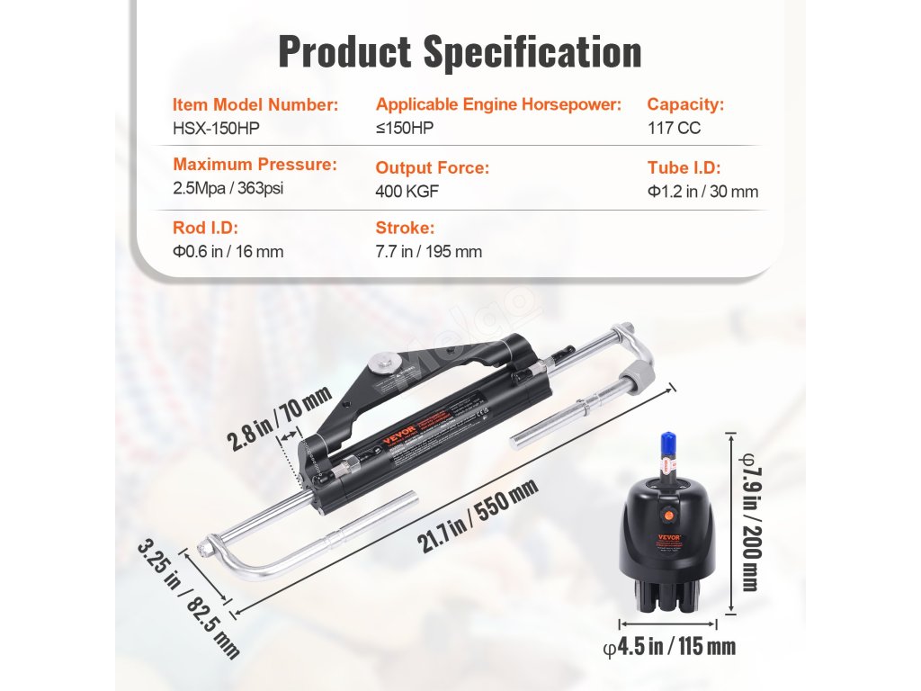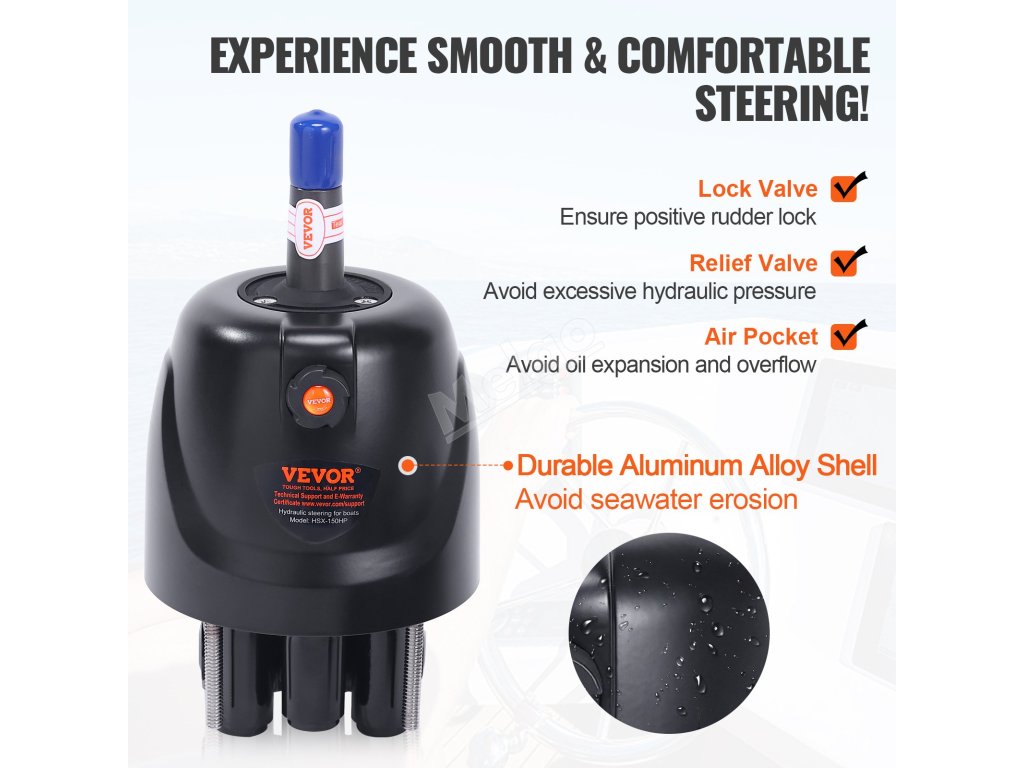Naše sada umožňuje instalaci hydraulického systému řízení na motory o výkonu až 150 koní. Hřídel řízení má plášť z hliníkové slitiny, který odolává drsnému prostředí na moři. Hydraulický válec řízení obsahuje dvoucestný uzavírací ventil, který vám poskytne vynikající kvalitu pro námořní použití.