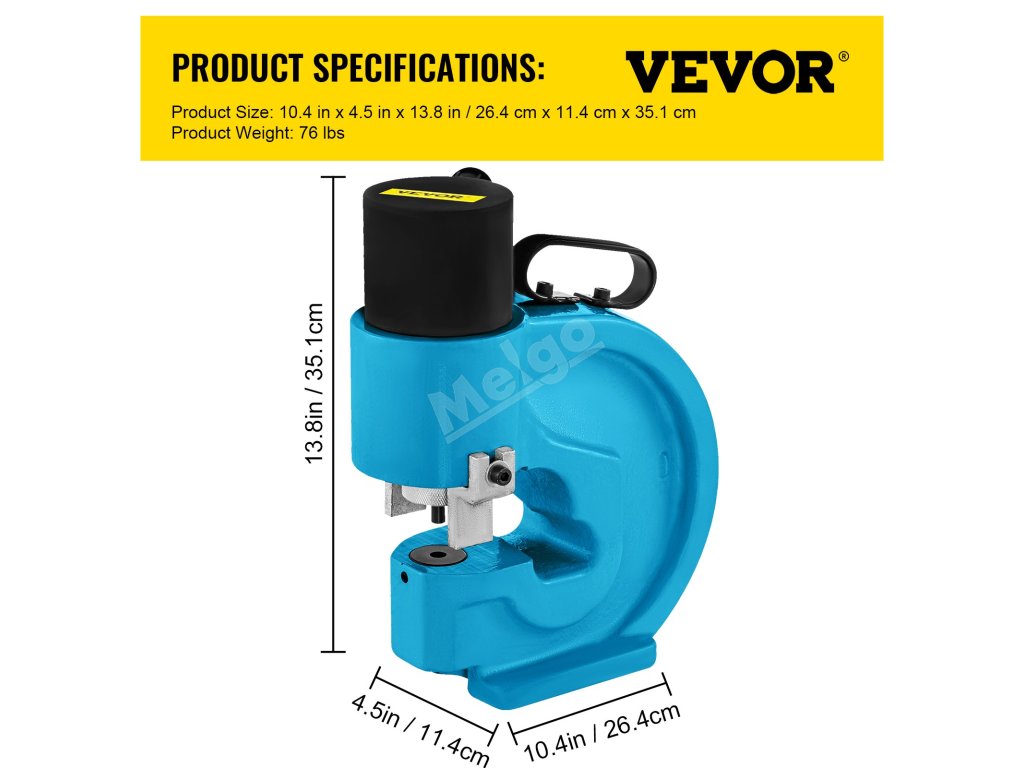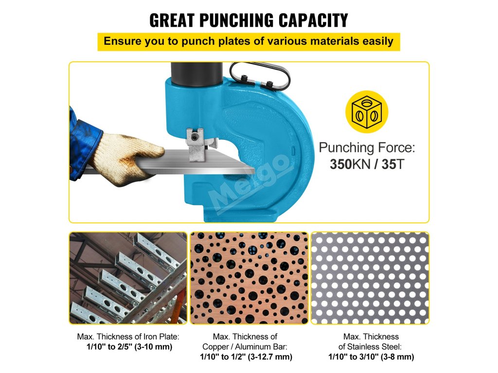 Tento hydraulický děrovač je vhodný pro železné plechy o tloušťce 1/10" až 2/5" (3-10 mm), měděné/hliníkové plechy o tloušťce 1/10" až 1/2" (3-12,7 mm), nerezovou ocel o tloušťce 1/10" až 3/10" (3-8 mm). Razicí síla: 35T/350KN.
