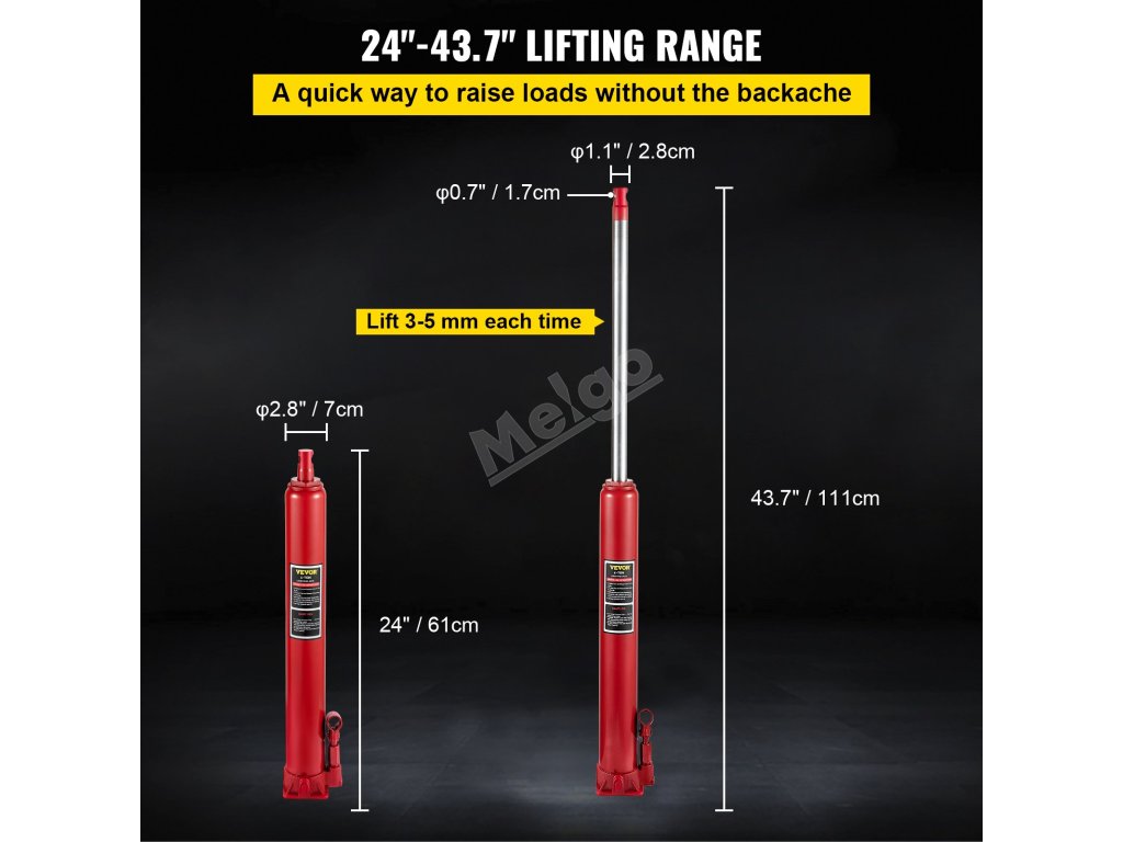 Zvedák s dlouhým beranem má rozsah zdvihu od 24" do 43,7" s dostatečným zdvihem 19,7". Zvedejte zvedák s lehkostí!