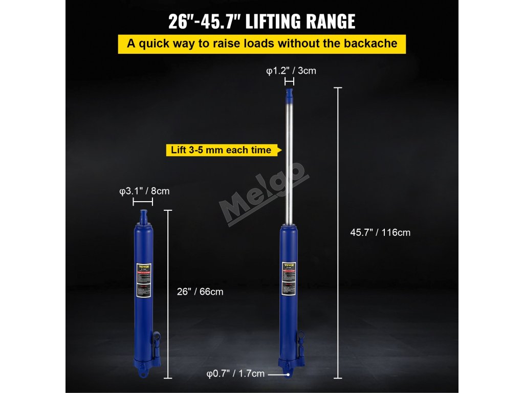 Zvedák s dlouhým beranem má rozsah zdvihu 26" až 45,7" s dostatečným zdvihem 19,7". Zvedejte zvedák s lehkostí!