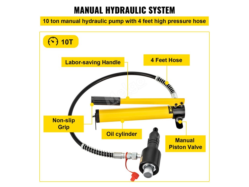 Náš ruční hydraulický systém může vyvinout tlak 10 T. Čtyřmetrová olejová hadice poskytuje větší flexibilitu při práci. Velký olejový válec se dobře drží a pružinová rukojeť zefektivňuje práci.