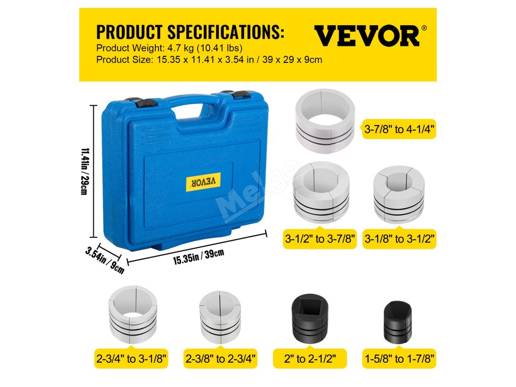 - Velikost expandéru: 1 5/8" - 1 7/8", 2" - 2 1/2", 2 3/8" - 2 3/4", 2 3/4" - 3 1/8", 3 1/8" - 3 1/2", 3 1/2" - 3 7/8", 3 7/8" - 4 1/4"