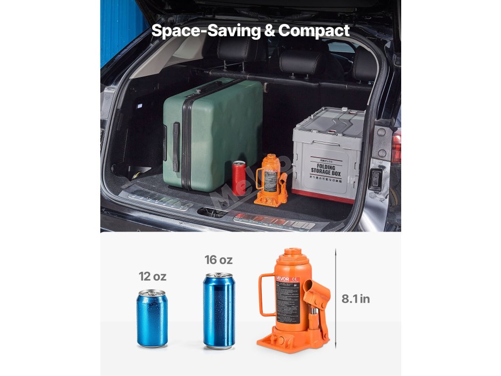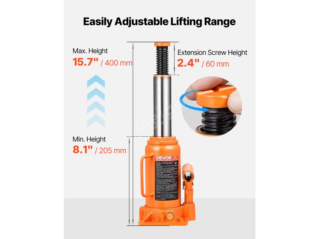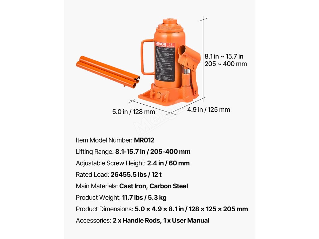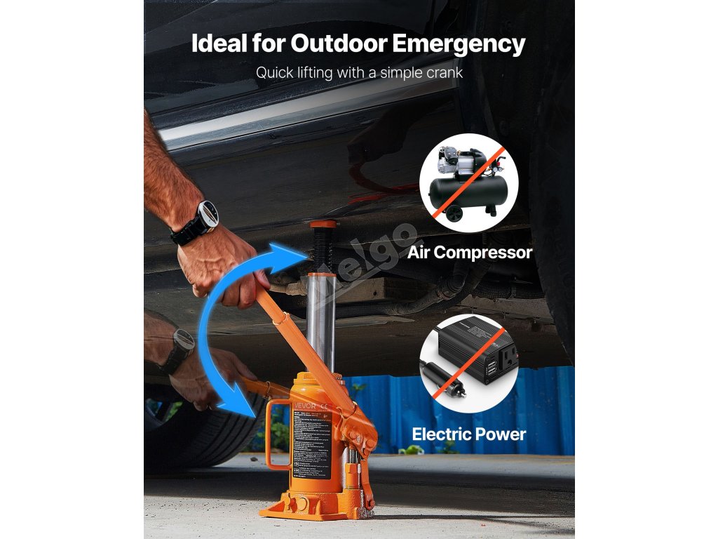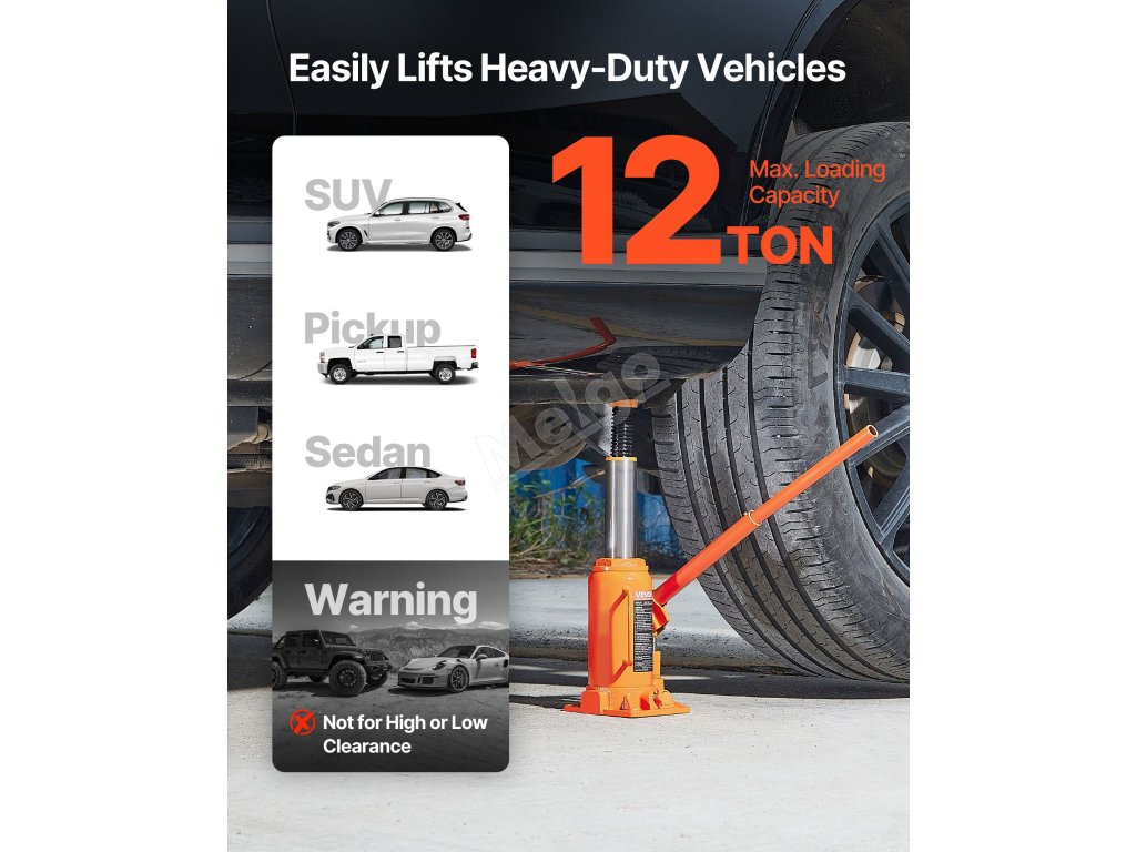 Tento hydraulický zvedák na láhve zvedá pomocí ručního čerpání stabilní silou až 12 tun (26 455,5 liber) - není potřeba elektřina ani vzduch. Je to spolehlivá volba pro těžké práce kolem domu, garáže nebo příjezdové cesty.