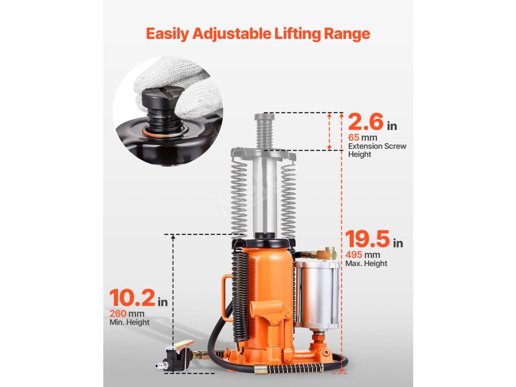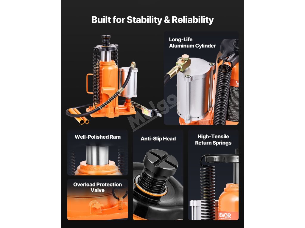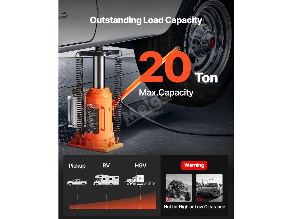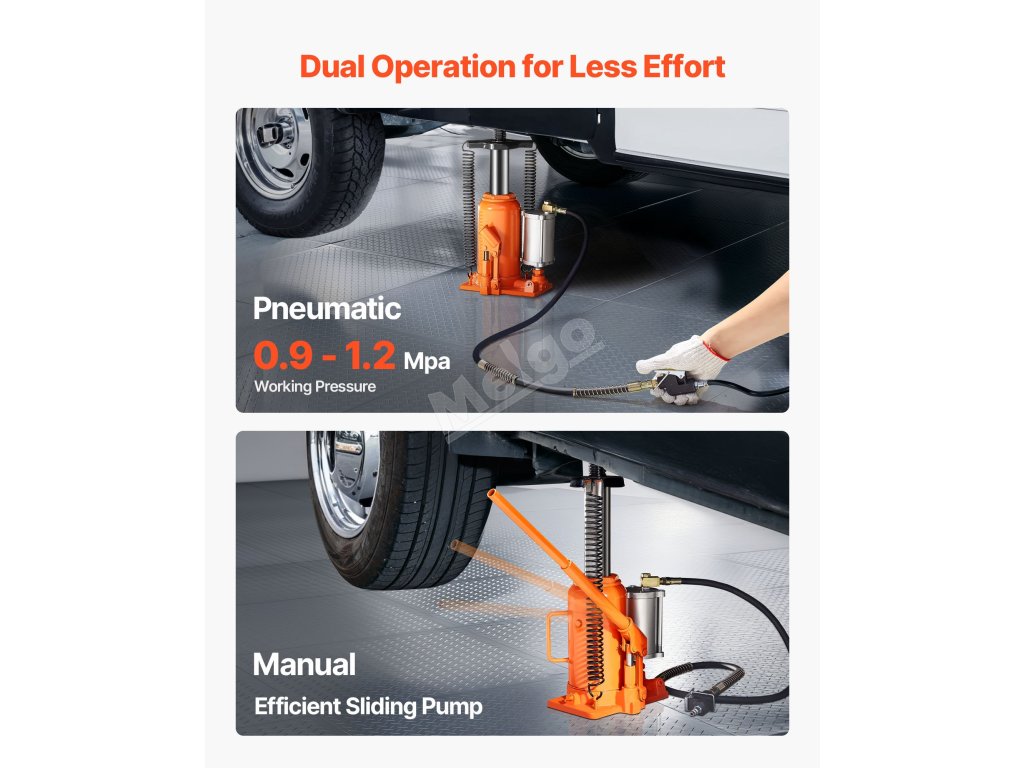 Tento ruční a pneumatický hydraulický zvedák lahví využívá hydraulickou sílu ke stabilnímu zvedání až 20 tun. Zvládne těžké úkoly, jako jsou opravy vozidel nebo domácí údržba skříňových nákladních automobilů, obytných vozů, pickupů a SUV.