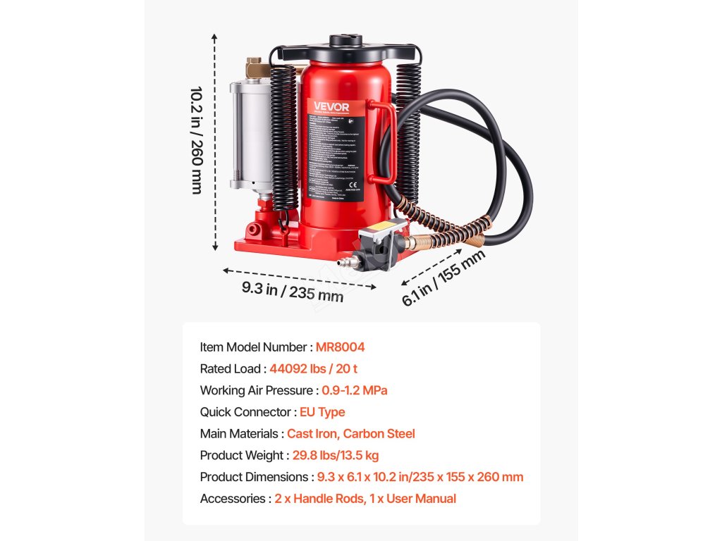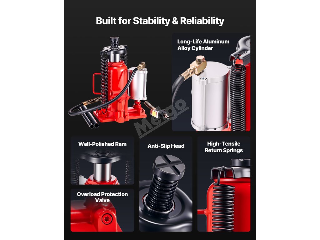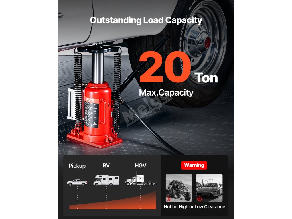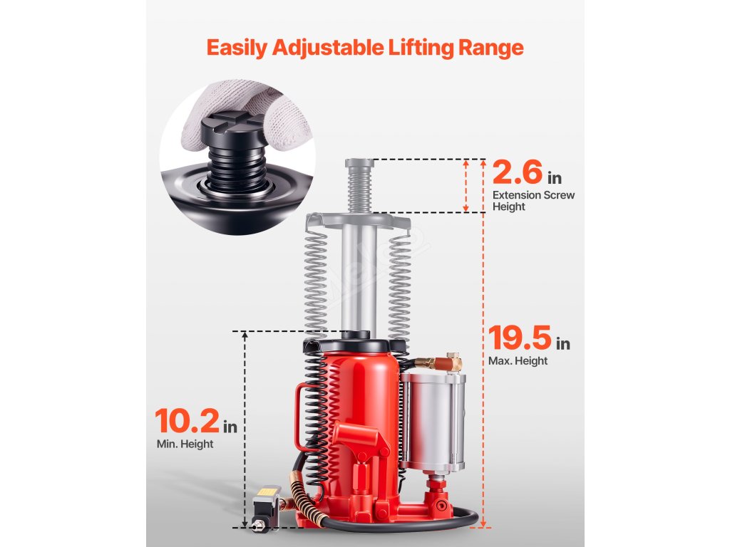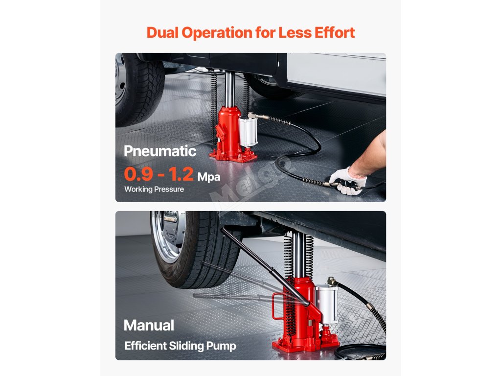 Tento ruční a pneumatický hydraulický zvedák lahví využívá hydraulickou sílu ke stabilnímu zvedání až 20 tun. Zvládne těžké úkoly, jako jsou opravy vozidel nebo domácí údržba skříňových nákladních automobilů, obytných vozů, pickupů a SUV.