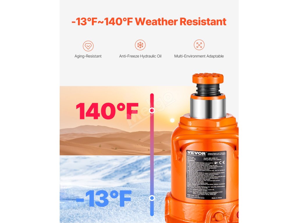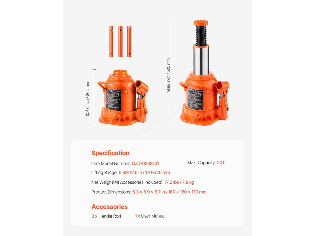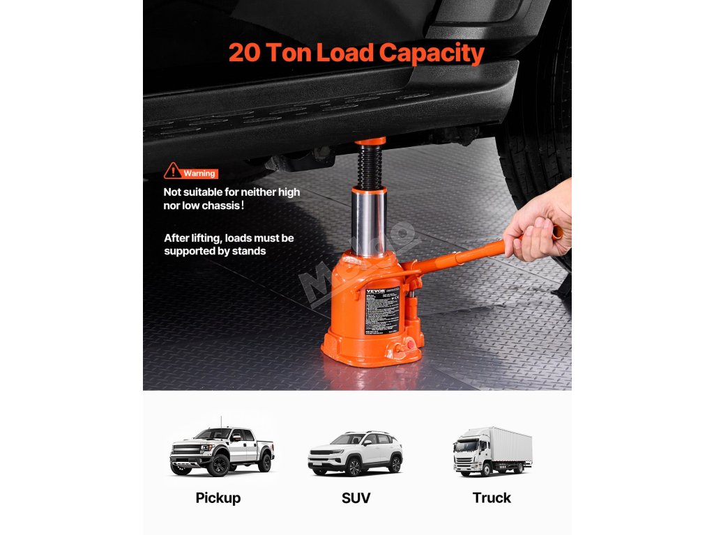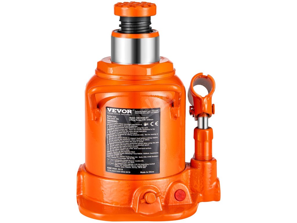 Rozlučte se s obtížemi při zvedání! Tento 20tunový hydraulický zvedák na láhve má rozsah zdvihu 6,69 - 12,6 palce a snadno si poradí s těžkými vozidly. Hydraulický válec odolný proti úniku zajišťuje dlouhou životnost. Je kompaktní a přenosný, takže je ideální pro rychlou výměnu pneumatik a opravy.