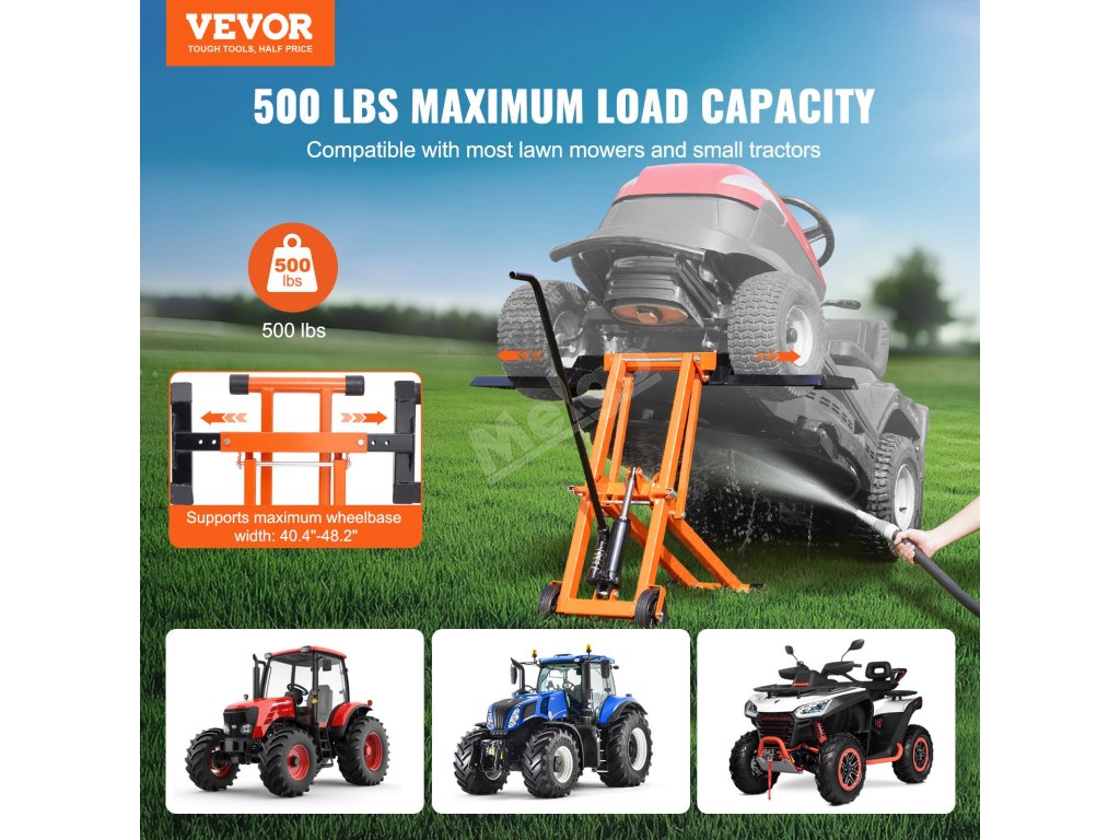 Tento zvedák na sekačky je vybaven hydraulickým systémem, který umožňuje bez námahy zvedat vozidla o hmotnosti až 500 kg. Je kompatibilní s různými pojízdnými sekačkami a malými terénními vozidly, takže je ideální pro běžnou údržbu, broušení nožů, výměnu nožů, výměnu řemenů a odstraňování nečistot.