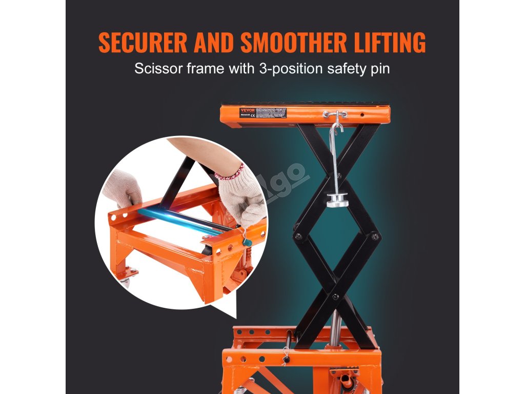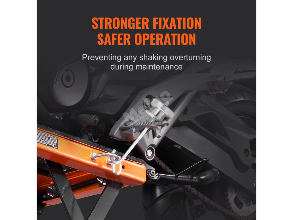 Pro větší bezpečnost použijte bezpečnostní kolík k zafixování výšky zvedáku motocyklu v požadované úrovni. To pomáhá snížit možnost pádu motocyklu a poskytuje klid při používání.