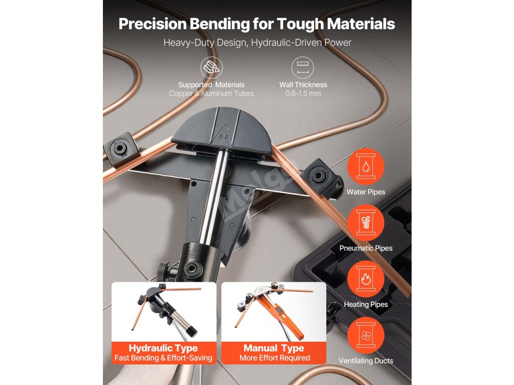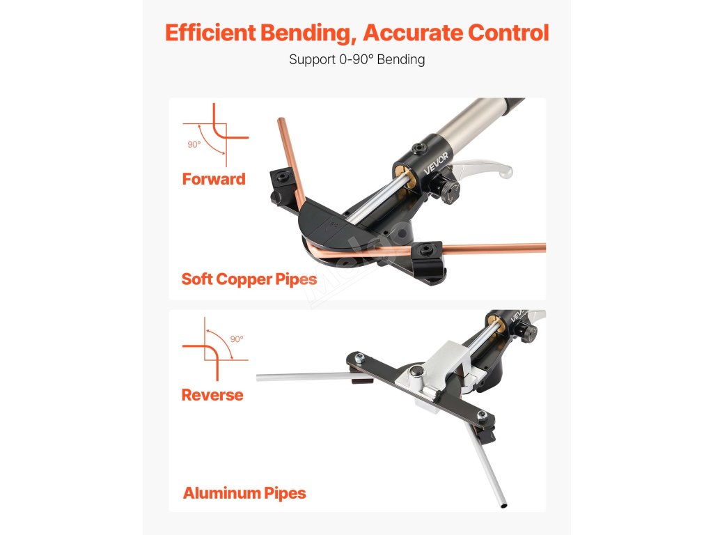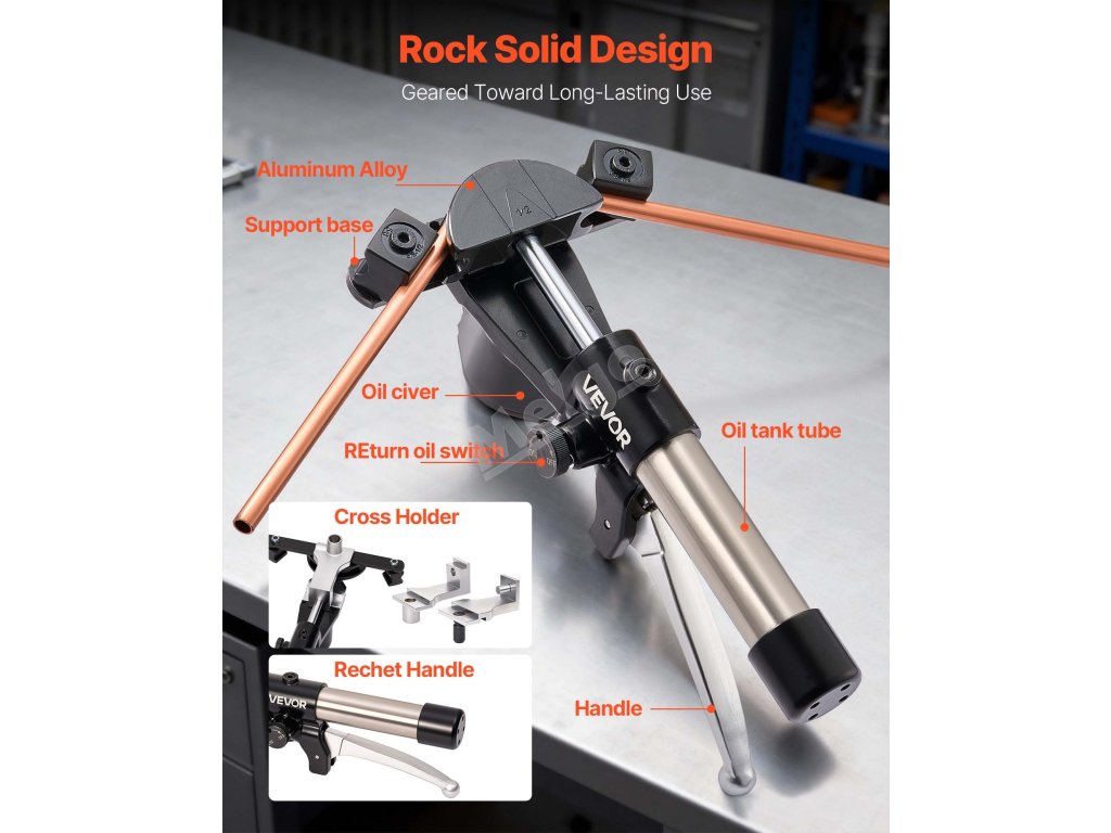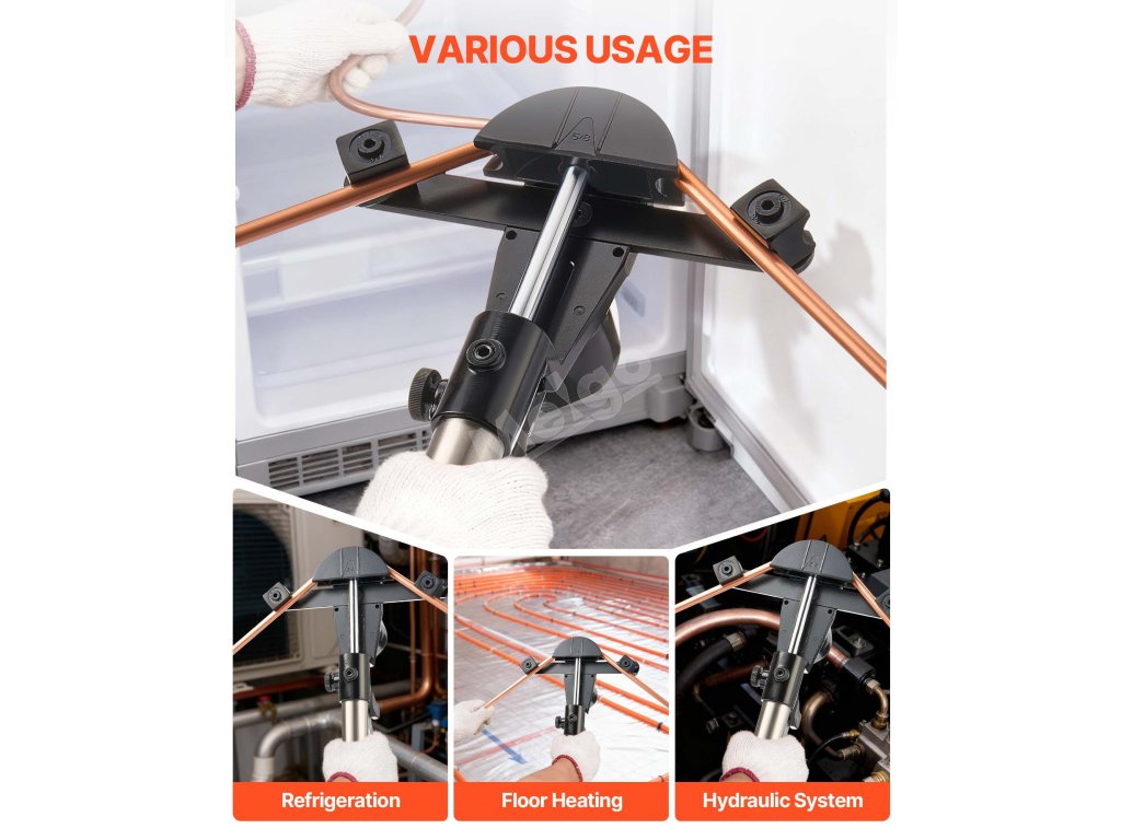 Tato ohýbačka trubek poháněná hydraulickým systémem snadno ohýbá měděné a hliníkové trubky o průměru 6 až 22 mm (1/4 až 7/8 palce). Díky úhlu ohybu od 0° do 90°, 7 maticím z hliníkové slitiny a konstrukci umožňující ohýbání ve dvou směrech je určena pro instalaci systémů HVAC, opravy automobilů a průmyslovou údržbu.