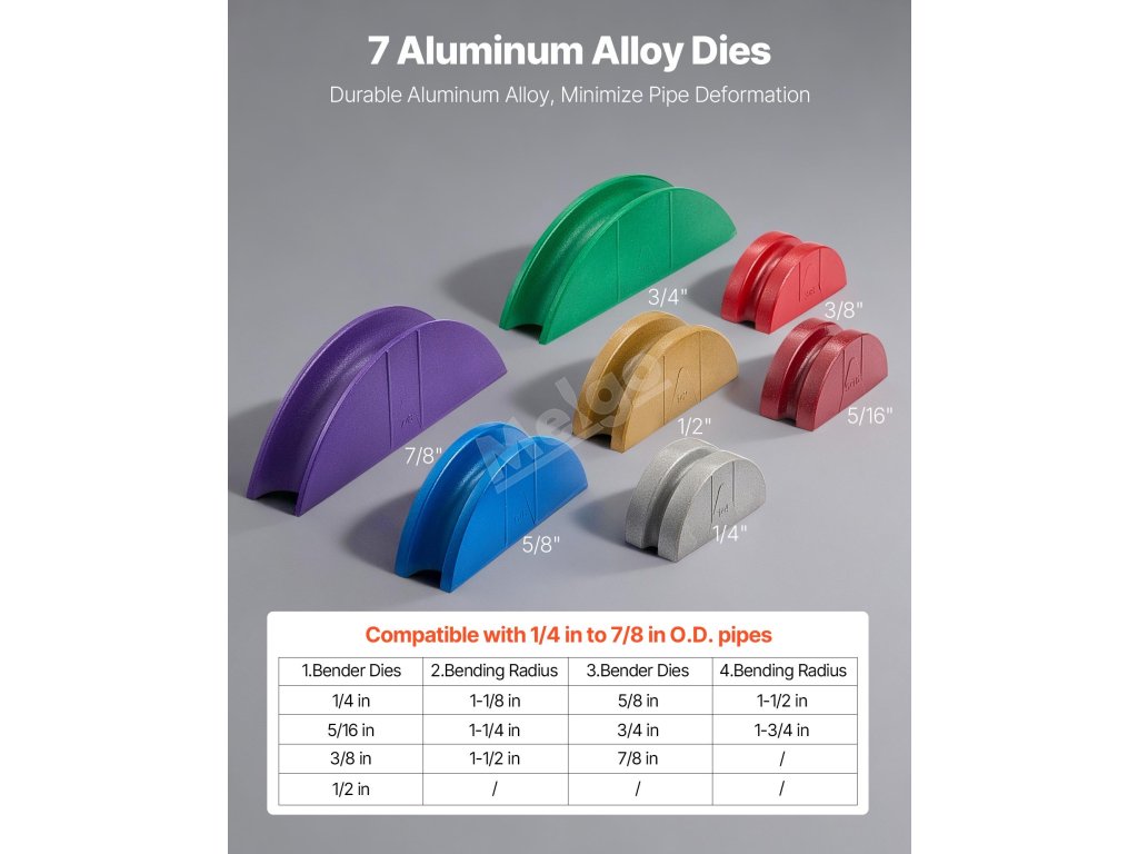 Tato ohýbačka trubek obsahuje 7 jasně označených ohýbacích matic, takže výběr velikosti je rychlý a přesný. Zvyšte produktivitu a konzistenci při každém ohybu.