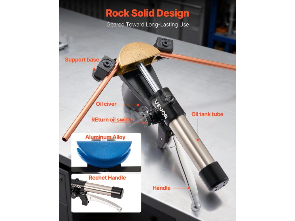 Tato ohýbačka trubek poháněná hydraulickým systémem snadno ohýbá měděné a hliníkové trubky o průměru 6 až 22 mm (1/4 až 7/8 palce). Díky úhlu ohybu 0° až 90°, 7 maticím z hliníkové slitiny a konstrukci umožňující ohýbání ve dvou směrech je určena pro instalaci systémů HVAC, opravy automobilů a průmyslovou údržbu.