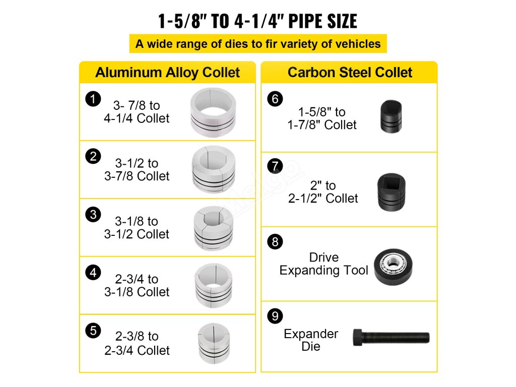 Součástí dodávky jsou dva expandéry z měkké oceli a pět expandérů z hliníkové slitiny pro různé trubky. Výfukový expandér navíc nabízí různé objímky pro širokou škálu rozšíření od 1-5/8" do 4-1/4".
