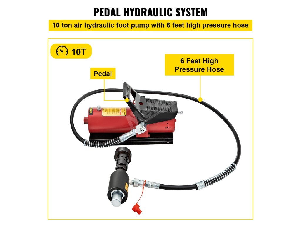 Naše vzduchové hydraulické čerpadlo na nože může vyvinout tlak 10 T. Olejová hadice o délce 6 stop poskytuje větší flexibilitu při práci. Velký olejový válec se dobře drží a pružinová rukojeť zefektivňuje práci.