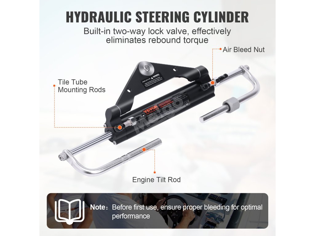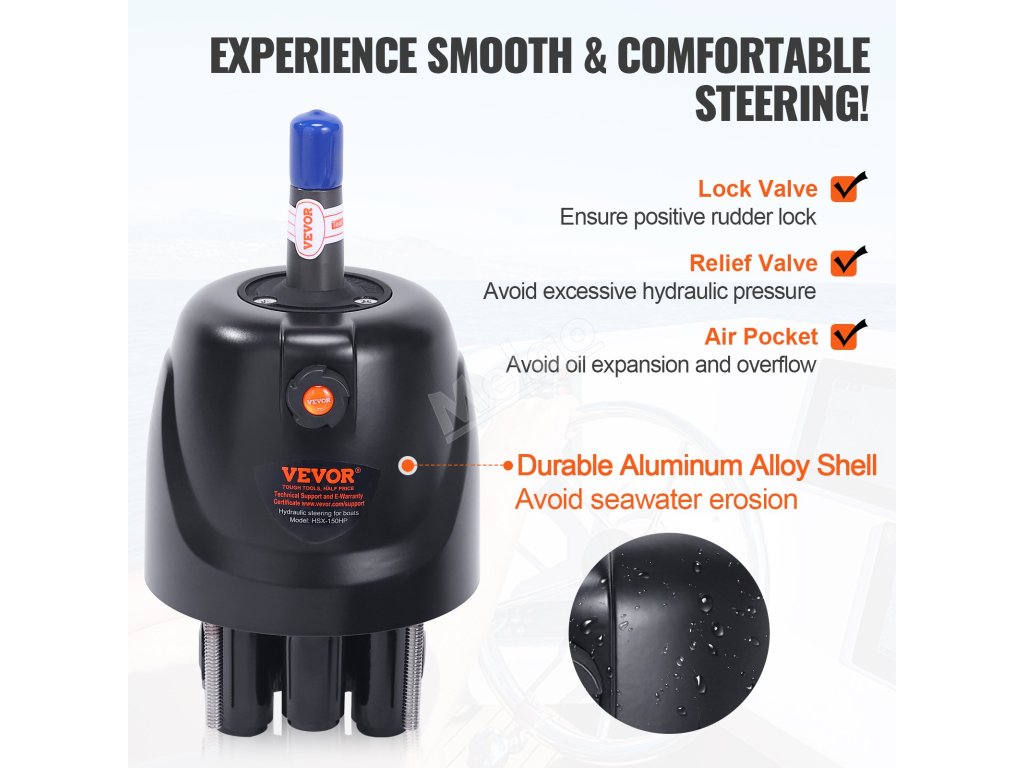 Naše sada umožňuje instalaci hydraulického systému řízení na motory s výkonem do 150 k. Hřídel řízení má plášť z hliníkové slitiny, který odolává drsnému mořskému prostředí. Hydraulický válec řízení obsahuje dvoucestný uzavírací ventil, který přináší vynikající kvalitu pro lodě.