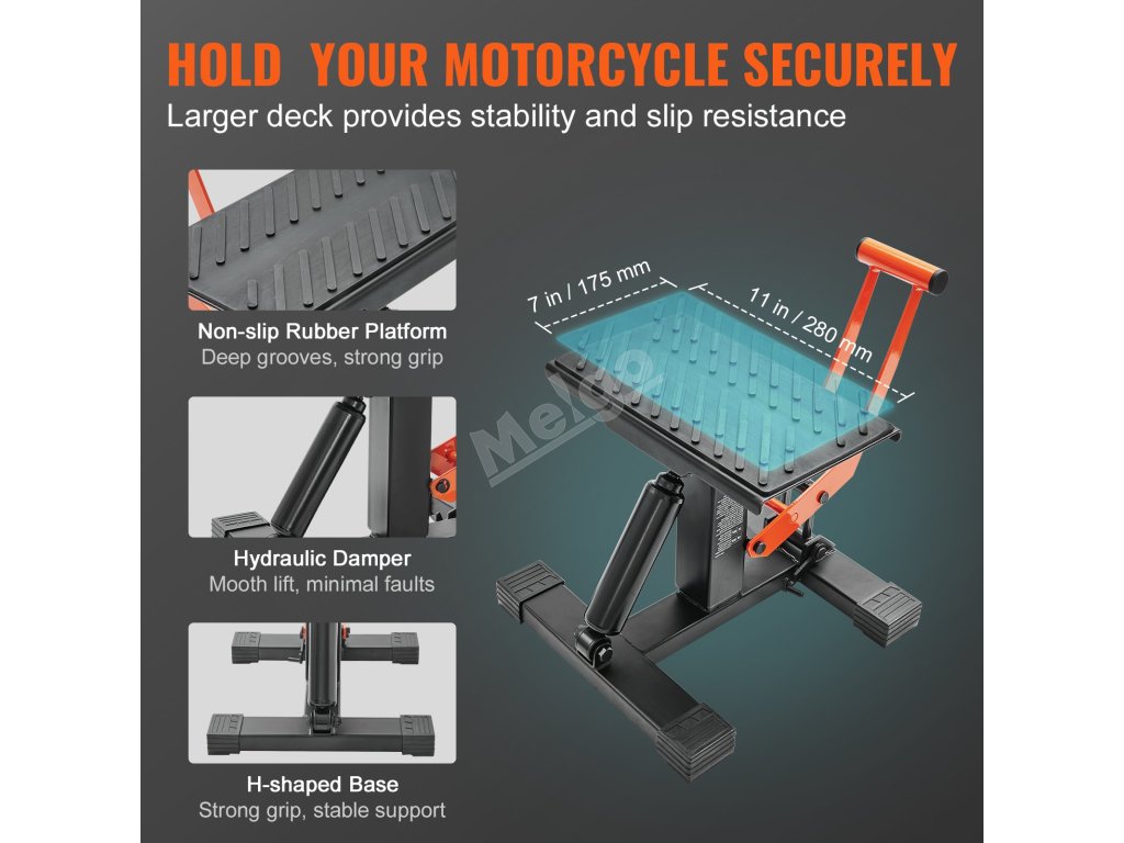 Protiskluzová gumová plošina se plně přizpůsobí spodní části motocyklu a nepoškodí jej. Čtyři rohy základny ve tvaru písmene H jsou opatřeny protiskluzovými gumovými podložkami, které zajišťují stabilitu na různých površích.