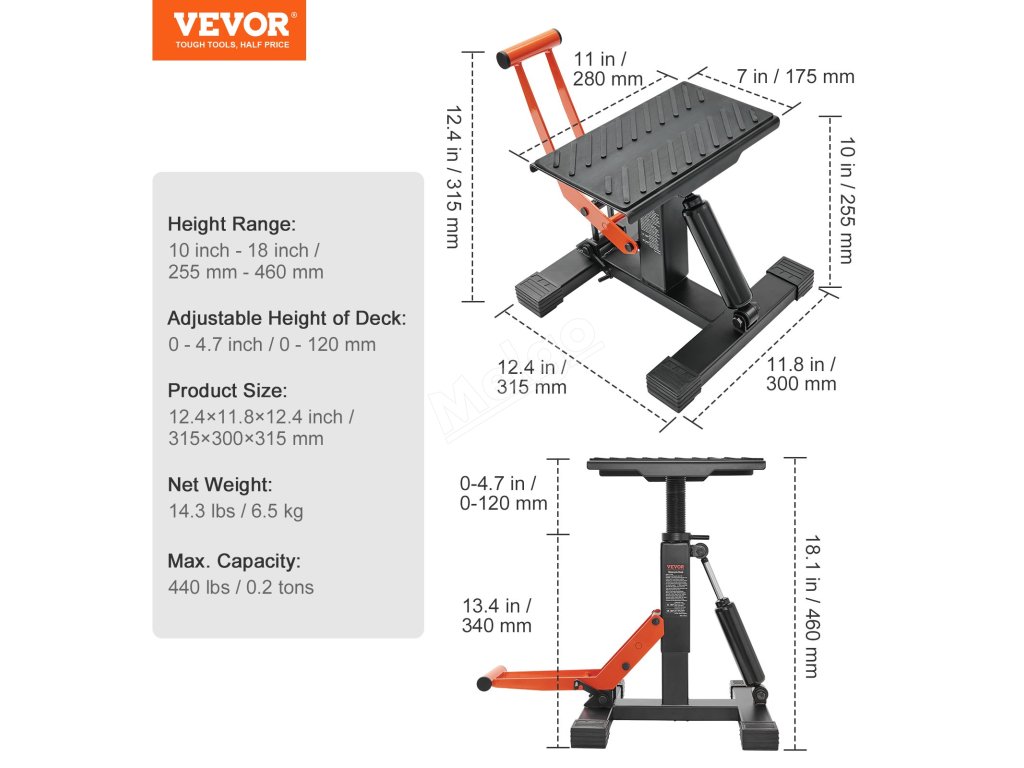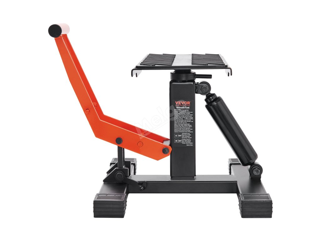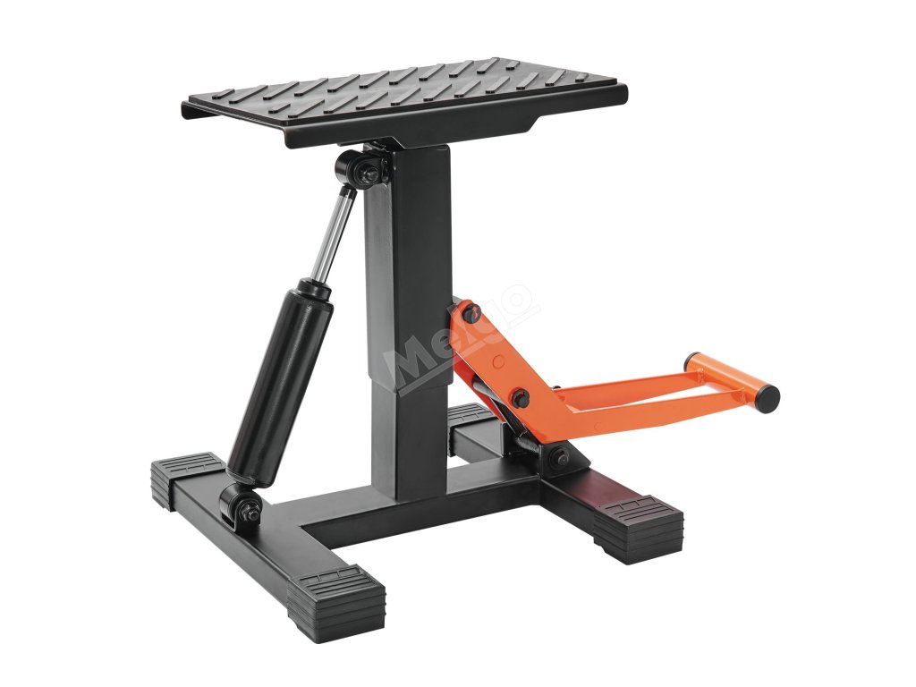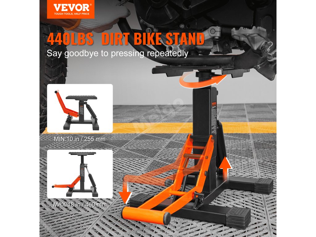 Stojan pro terénní motocykly má nastavitelnou výšku v rozmezí 10-18 palců/255-460 mm, což umožňuje umístit stojan doprostřed motoru motocyklu a přiblížit se k němu otáčením plošiny.