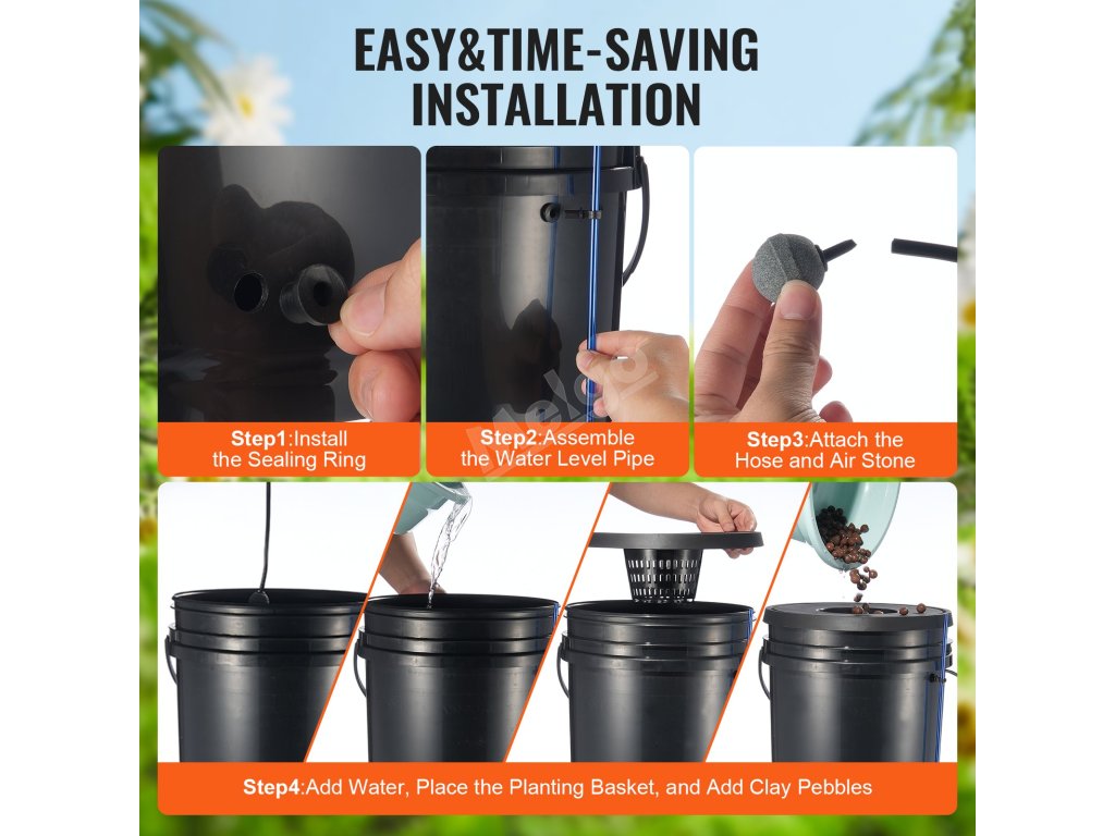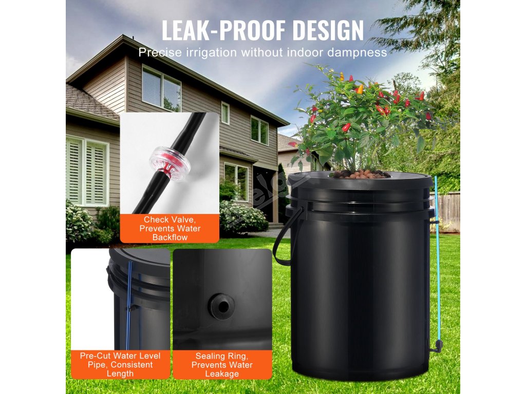 Hydroponické kbelíky z PP jsou pevné a odolné, 5" sázecí koše poskytují rostlinám více prostoru pro růst kořenů. Těsnicí kroužky a zpětné ventily účinně zabraňují úniku vody a zpětnému toku.