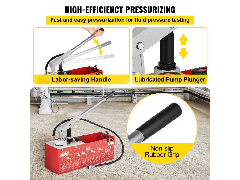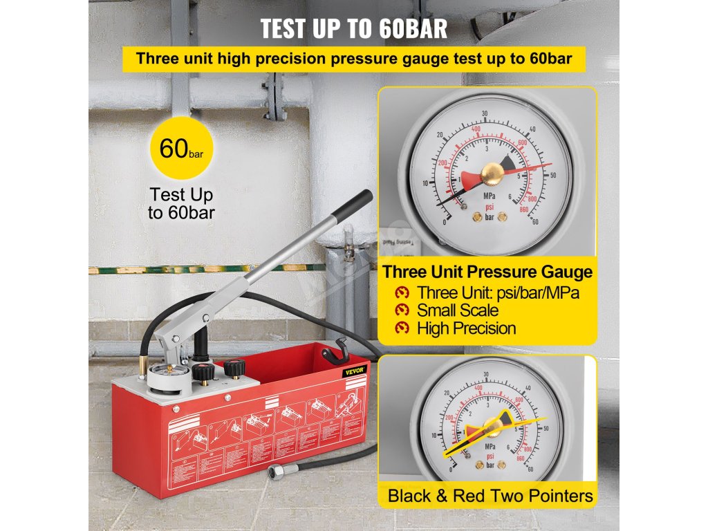 Naše čerpadlo pro tlakové zkoušky, které testuje až do 60 barů/860 psi/6 MPa, je vhodné pro širokou škálu aplikací. Manometr zobrazuje hodnoty tlaku ve třech jednotkách a s vysokou přesností.