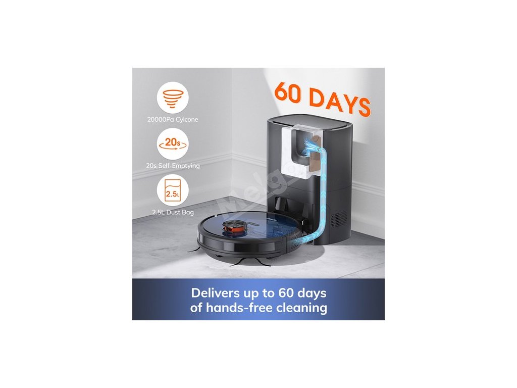 | Specifikace | Sání základní stanice: 20000Pa Sání robota: objem prachového sáčku: 2,5 l Nádržka na vodu: 240 ml Nádoba na prach: 250 ml Kapacita baterie: 3200 mAh Hladina hluku: 65 dB Výstupní práh: 18 mm Frekvence WIFI: 2,4 GHz Způsoby ovládání: aplikace, Alexa a Google Assistant |