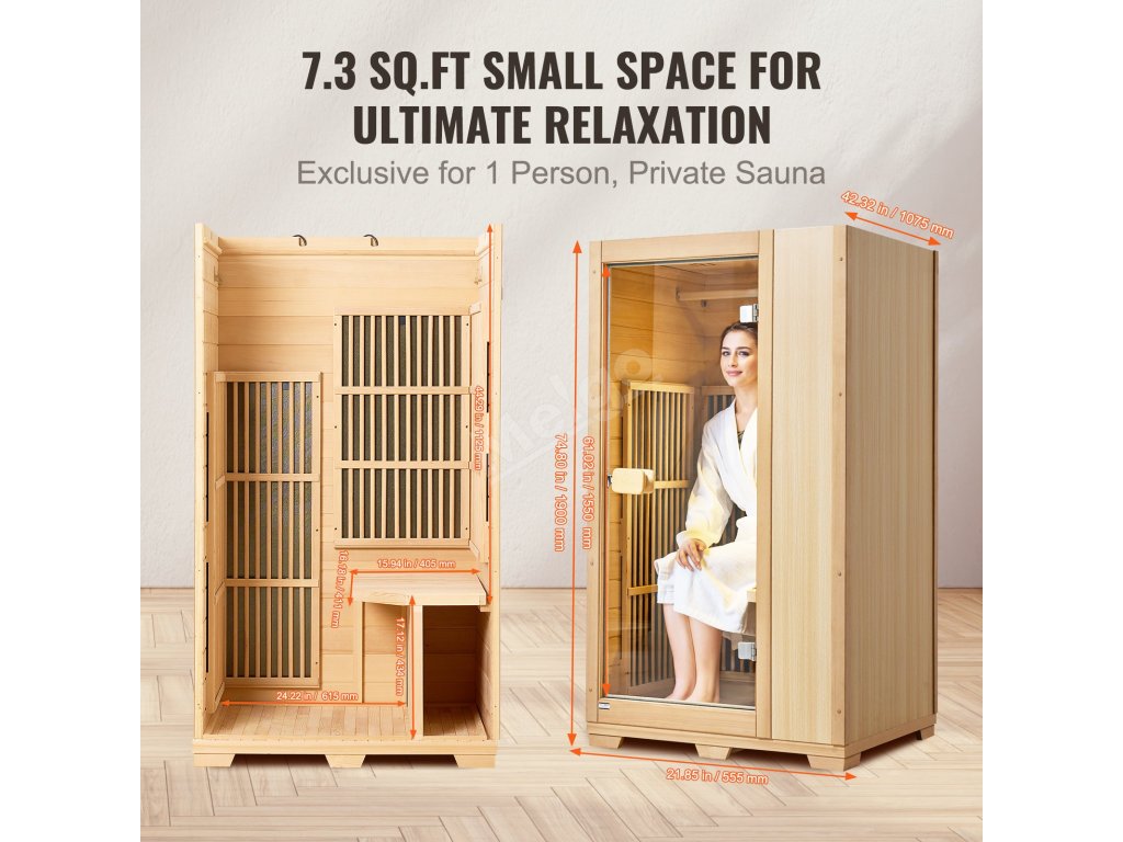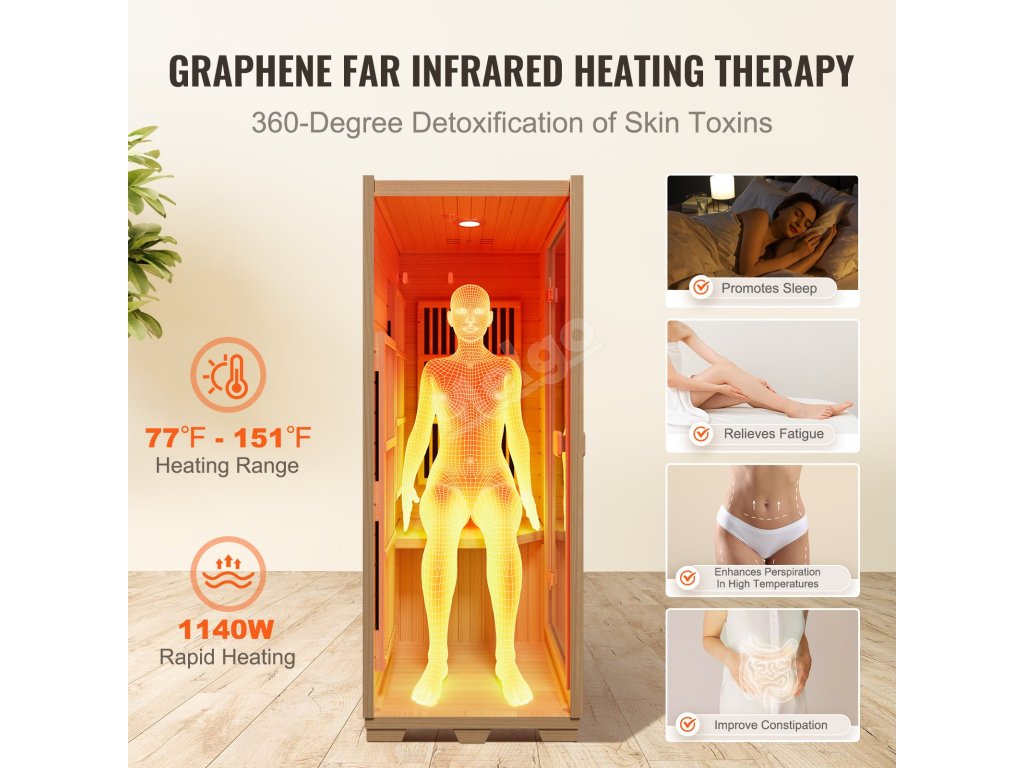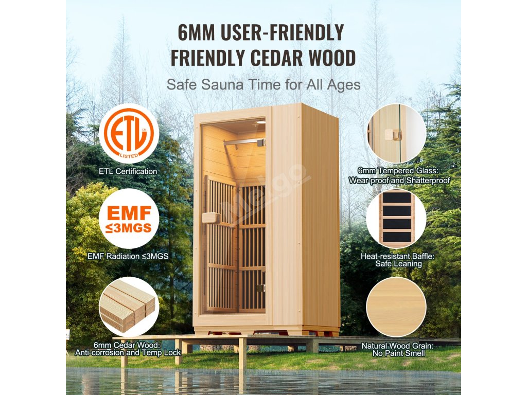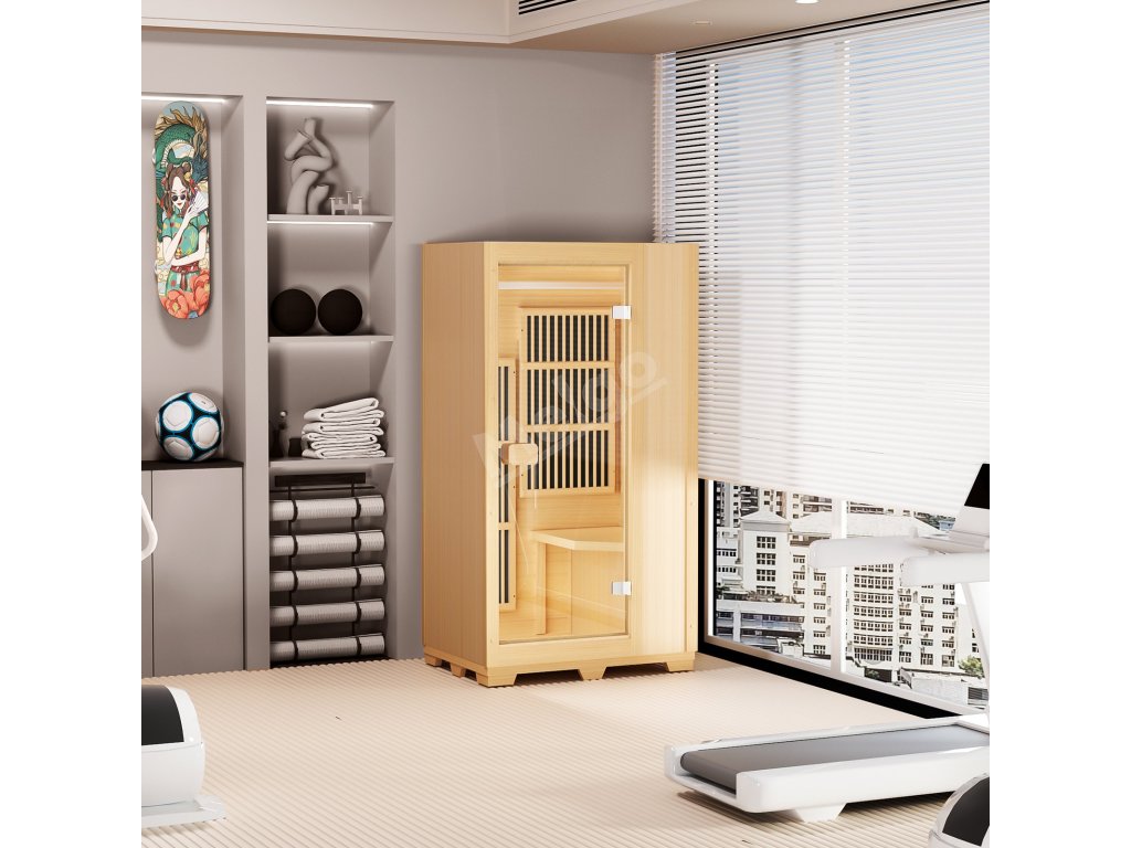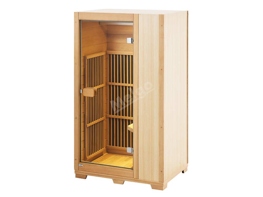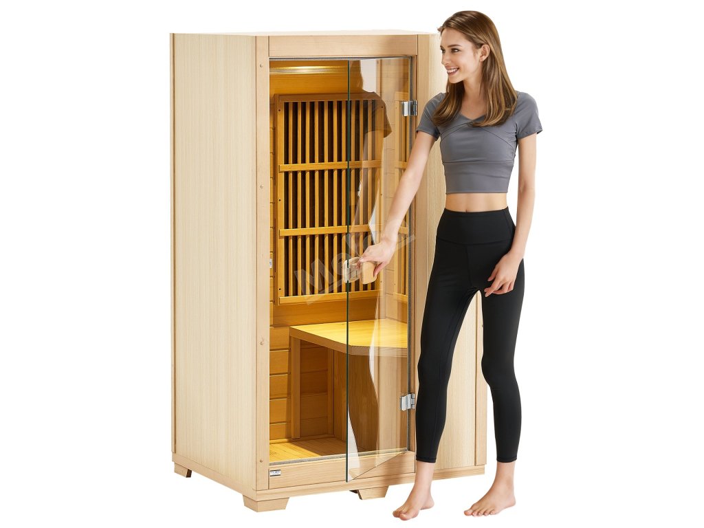 Infračervená dřevěná sauna 1-osobní, 1140W, temper. sklo, nízké emf