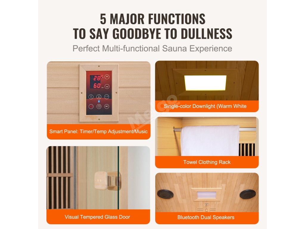 Inteligentní ovládací panelSaunová místnost je vybavena praktickým vestavěným ovládacím panelem, který zajišťuje dokonalý zážitek ze saunování. Můžete se připojit přes Bluetooth a přehrávat svou oblíbenou hudbu, aby byl zážitek ze saunování ještě příjemnější.
