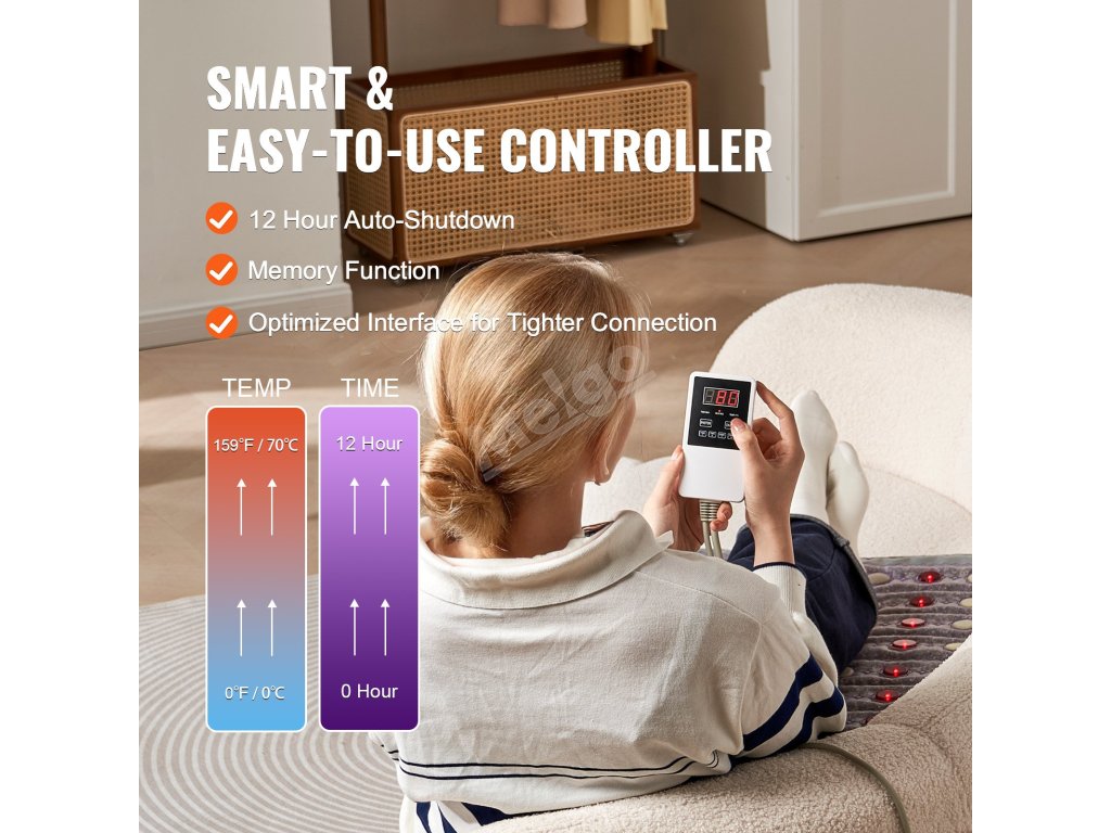 Pomocí chytrého ovladače můžete nastavit teplotu od 103°F do 159°F. Je také vybavena paměťovou funkcí, která si pamatuje poslední nastavení, časovačem s nastavením 0-12 hodin a funkcí automatického vypnutí, která zabraňuje nadměrnému používání a zajišťuje, že ji nikdy nezapomenete vypnout.