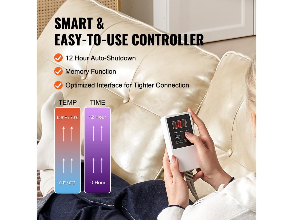 Pomocí chytrého ovladače můžete nastavit teplotu od 103°F do 159°F. Je také vybavena paměťovou funkcí, která si pamatuje poslední nastavení, časovačem s nastavením 0-12 hodin a funkcí automatického vypnutí, která zabraňuje nadměrnému používání a zajišťuje, že ji nikdy nezapomenete vypnout.