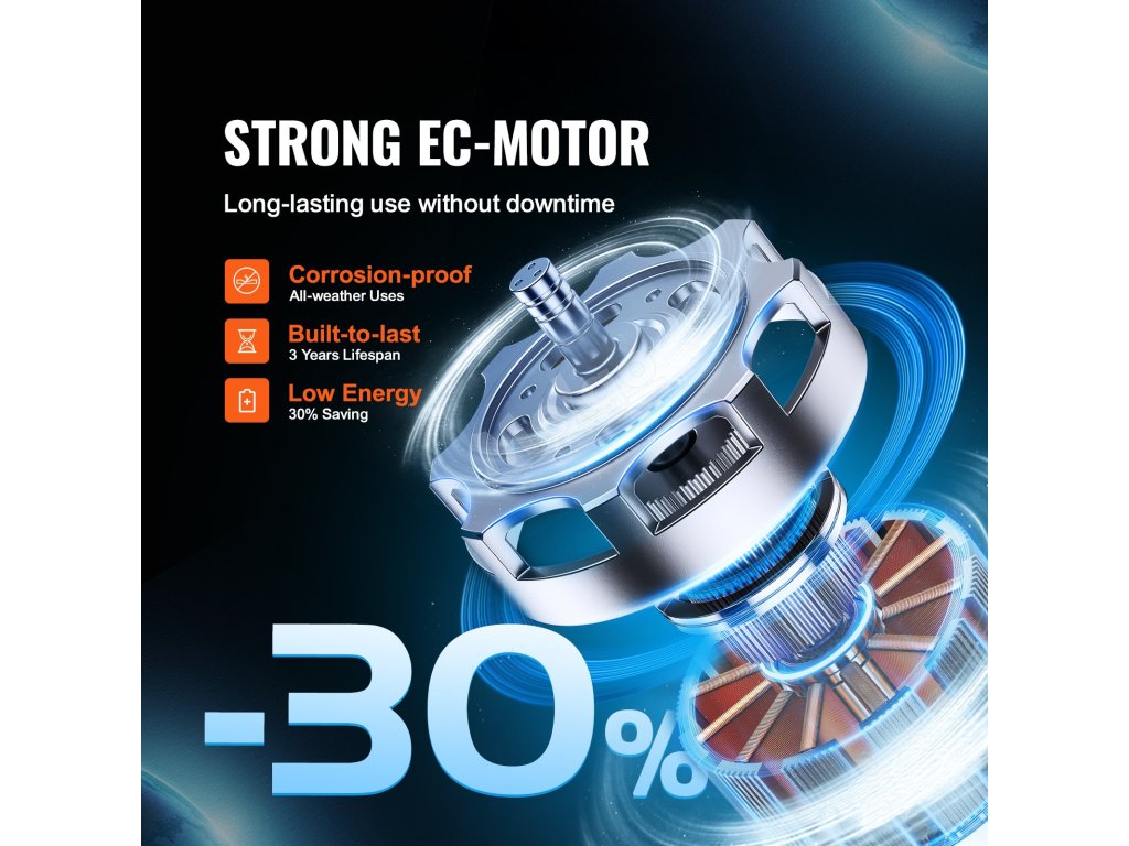 Odpověď. Náš ventilátor může dosáhnout 30 000 hodin nepřetržitého provozu. Energeticky účinný EC motor zajišťuje mimořádně stabilní provoz.
