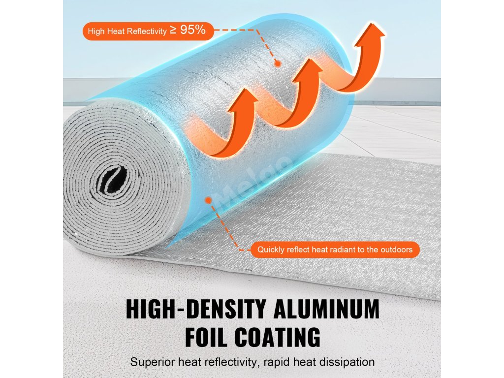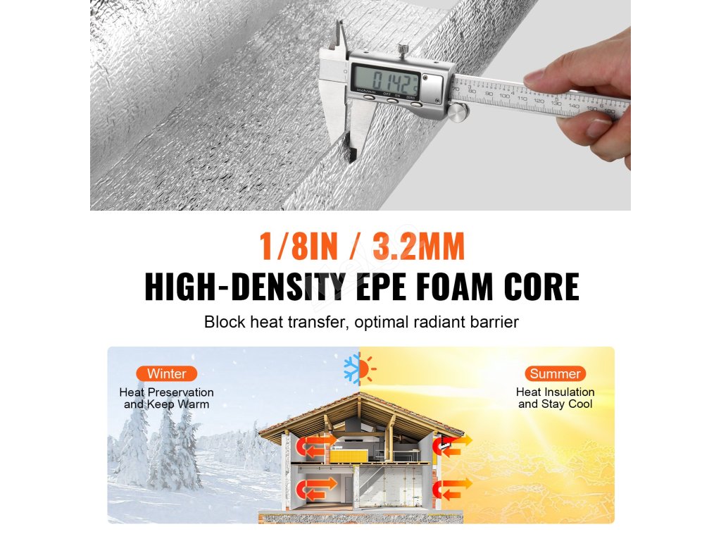 Dvojitá reflexní izolační role VEVOR má ≥ 95 % vysokou odrazivost pomocí dvojité reflexní hliníkové fólie a jádra z pěny EPE s vysokou hustotou. V létě účinně blokuje sluneční záření a v zimě zabraňuje tepelným ztrátám v interiéru, čímž udržuje příjemnou vnitřní teplotu.
