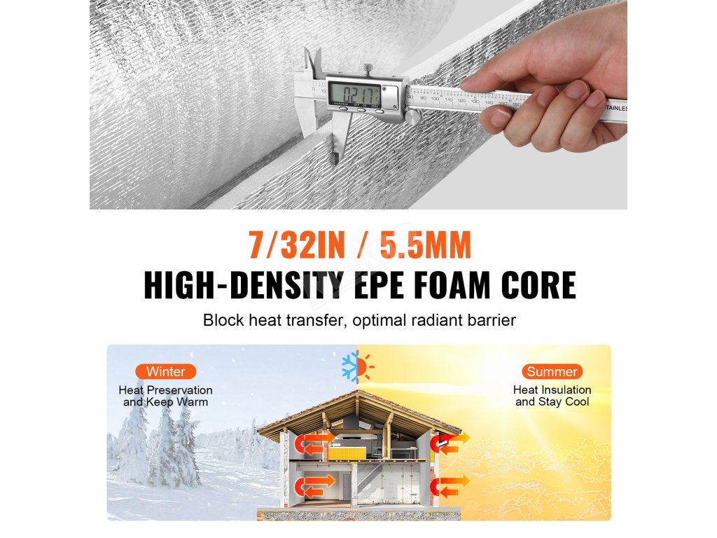 Dvojitá reflexní izolační role VEVOR má ≥ 95 % vysokou odrazivost pomocí dvojité reflexní hliníkové fólie a jádra z pěny EPE s vysokou hustotou. V létě účinně blokuje sluneční záření a v zimě zabraňuje tepelným ztrátám v interiéru, čímž udržuje příjemnou vnitřní teplotu.