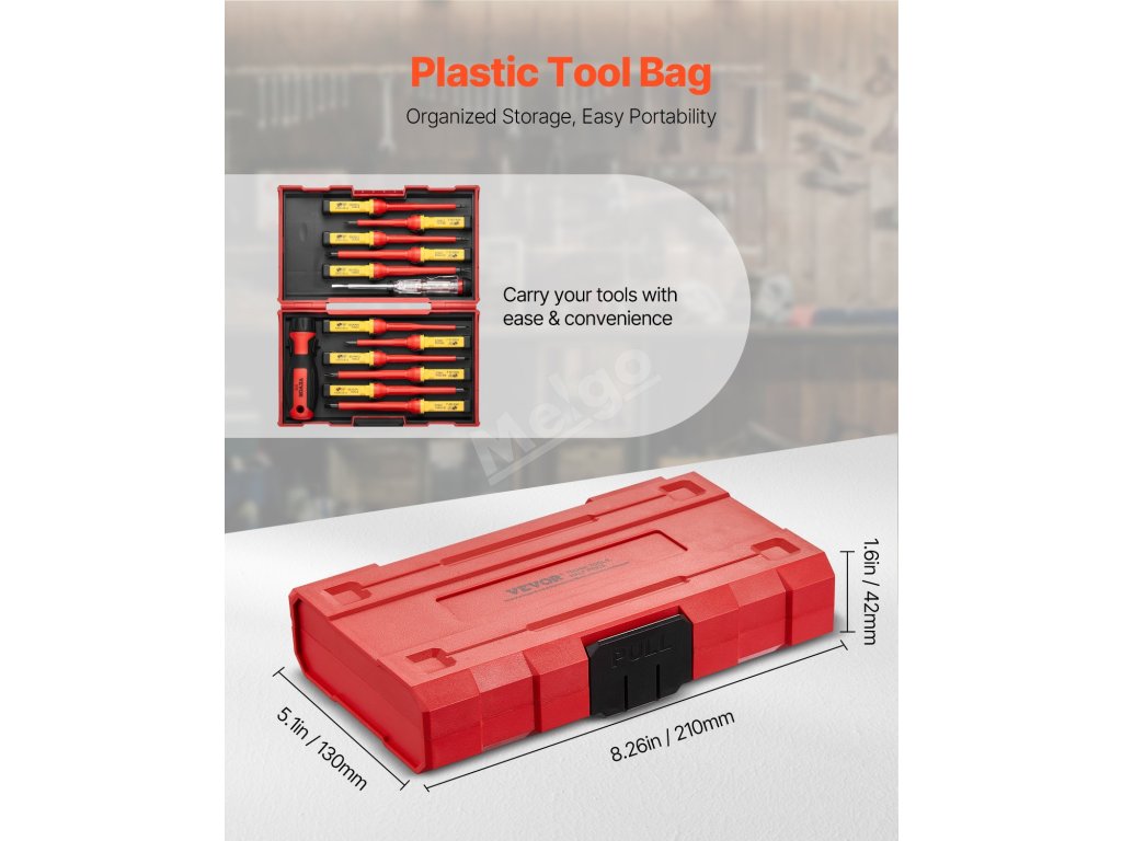 Naše izolované nářadí pro elektrikáře je pečlivě dimenzováno tak, aby se dobře vešlo do boxu na nářadí, což usnadňuje rychlé nalezení potřebného nářadí a zároveň účinně chrání nářadí před poškozením.